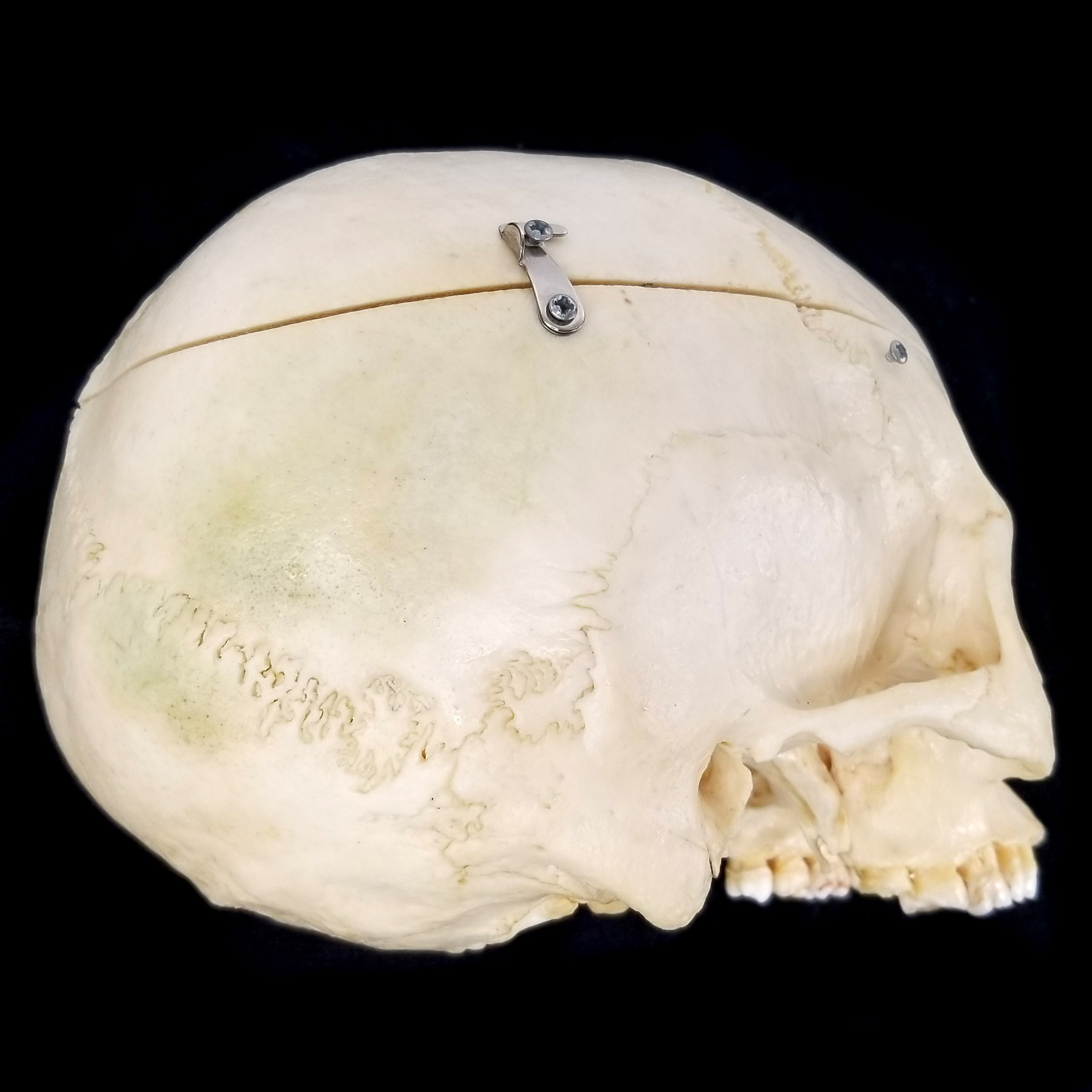 Adult human skull with epipteric bone and three ossicles surrounding asterion. Right posterolateral view. |