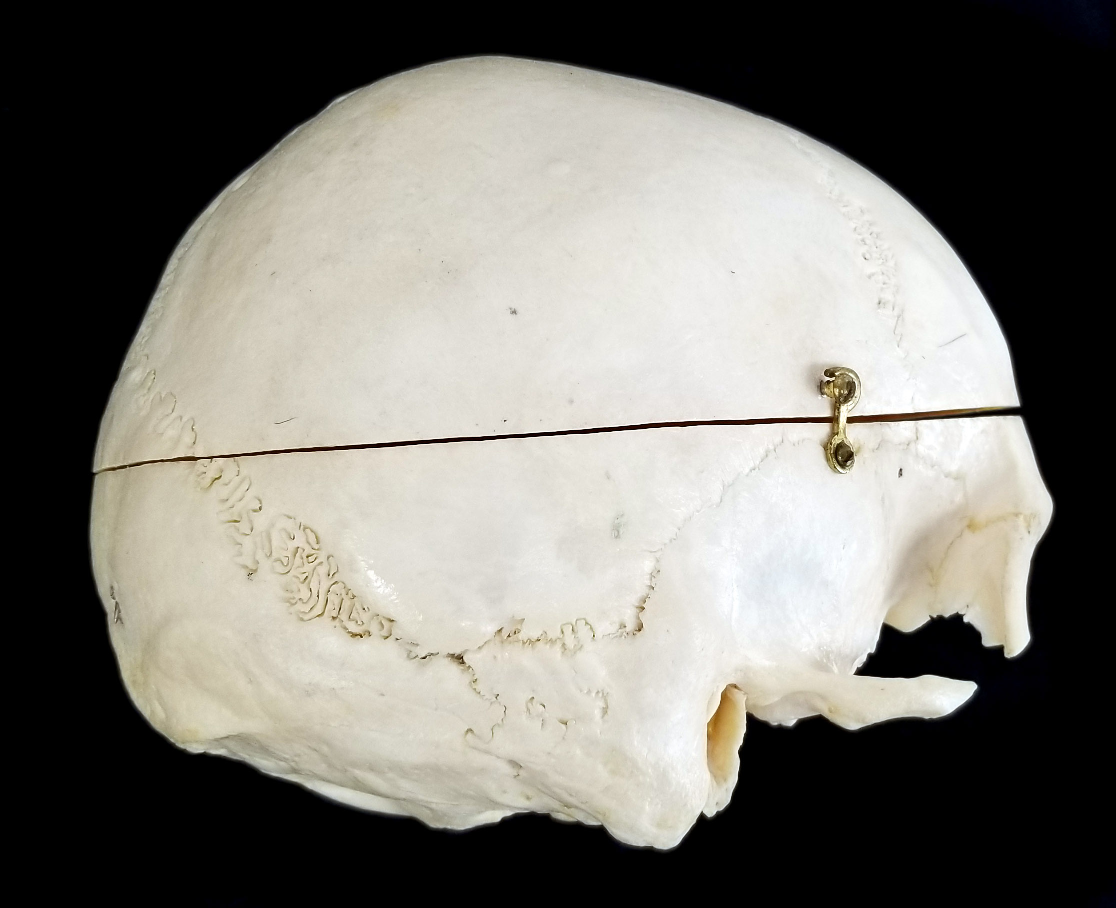 Adult human skull with trace of squamomastoid suture. Right posterolateral view of cranium. |