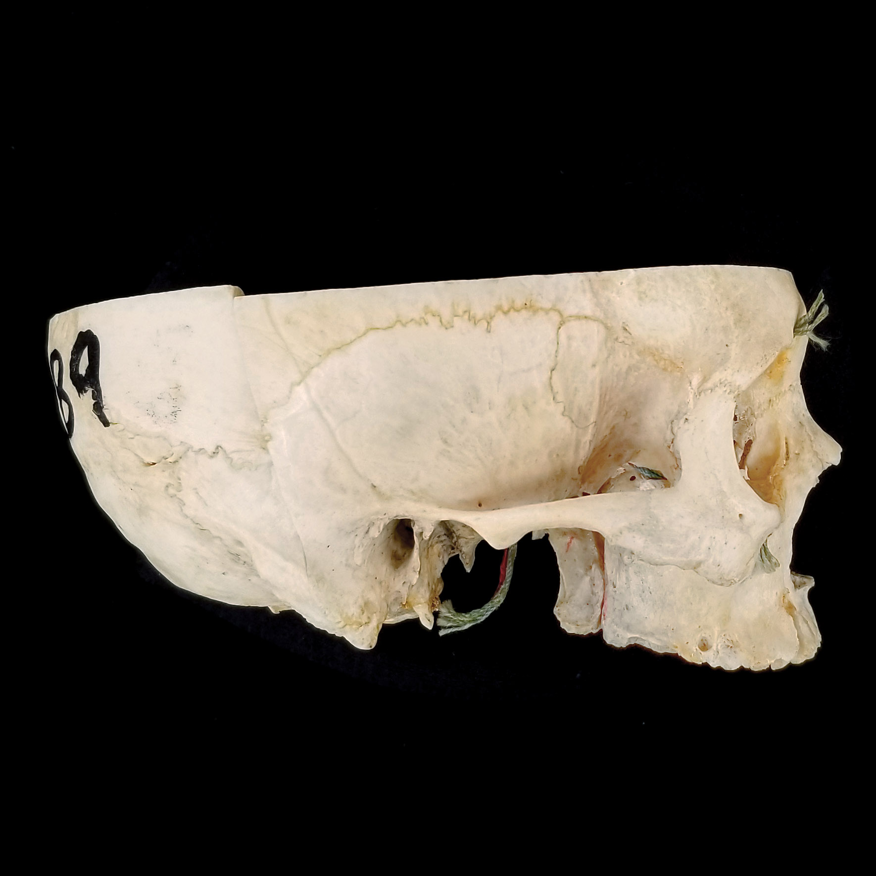 Adult human skull. (String is demonstration of nerves.) Right lateral view. |