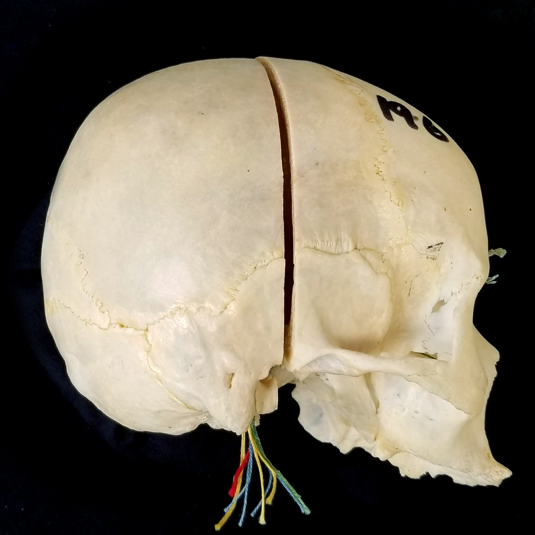 Adult human skull with ossicle near pterion. (String is demonstration of nerves.) Right lateral view. |