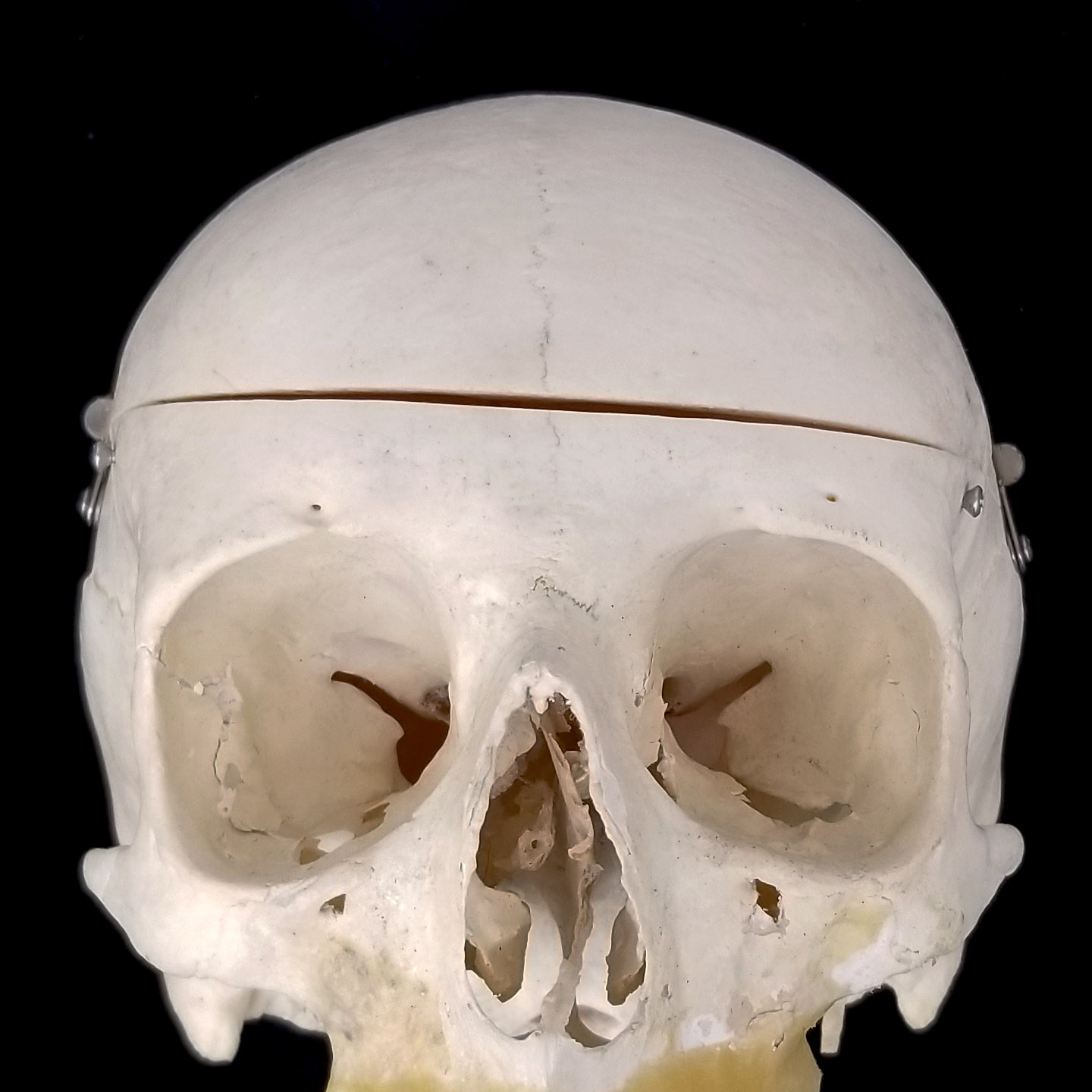 Adult human skull with metopic suture. (Specimen has extensive damage and material from repair.) Anterior view. |