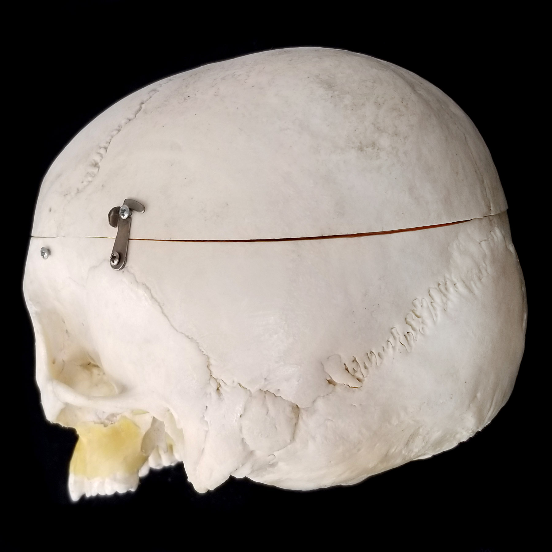 Adult human skull with large ossicle at asterion and squamomastoid suture. (Specimen has artificial teeth and material from repair.) Left posterolateral view. |