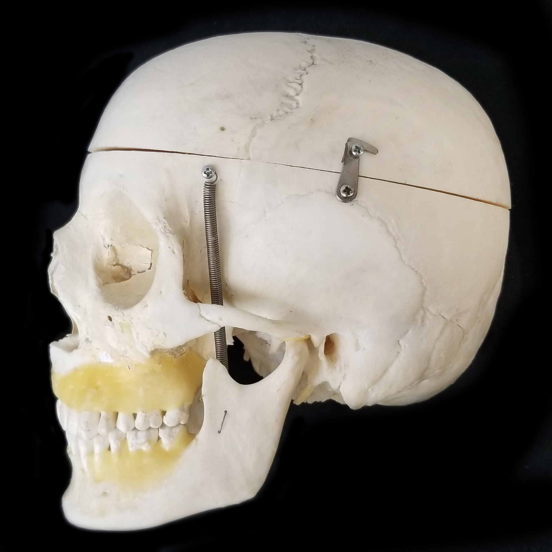 Adult human skull with large ossicle at asterion and squamomastoid suture. (Specimen has damage to orbit, artificial teeth, and material from repair.) Left lateral view. |