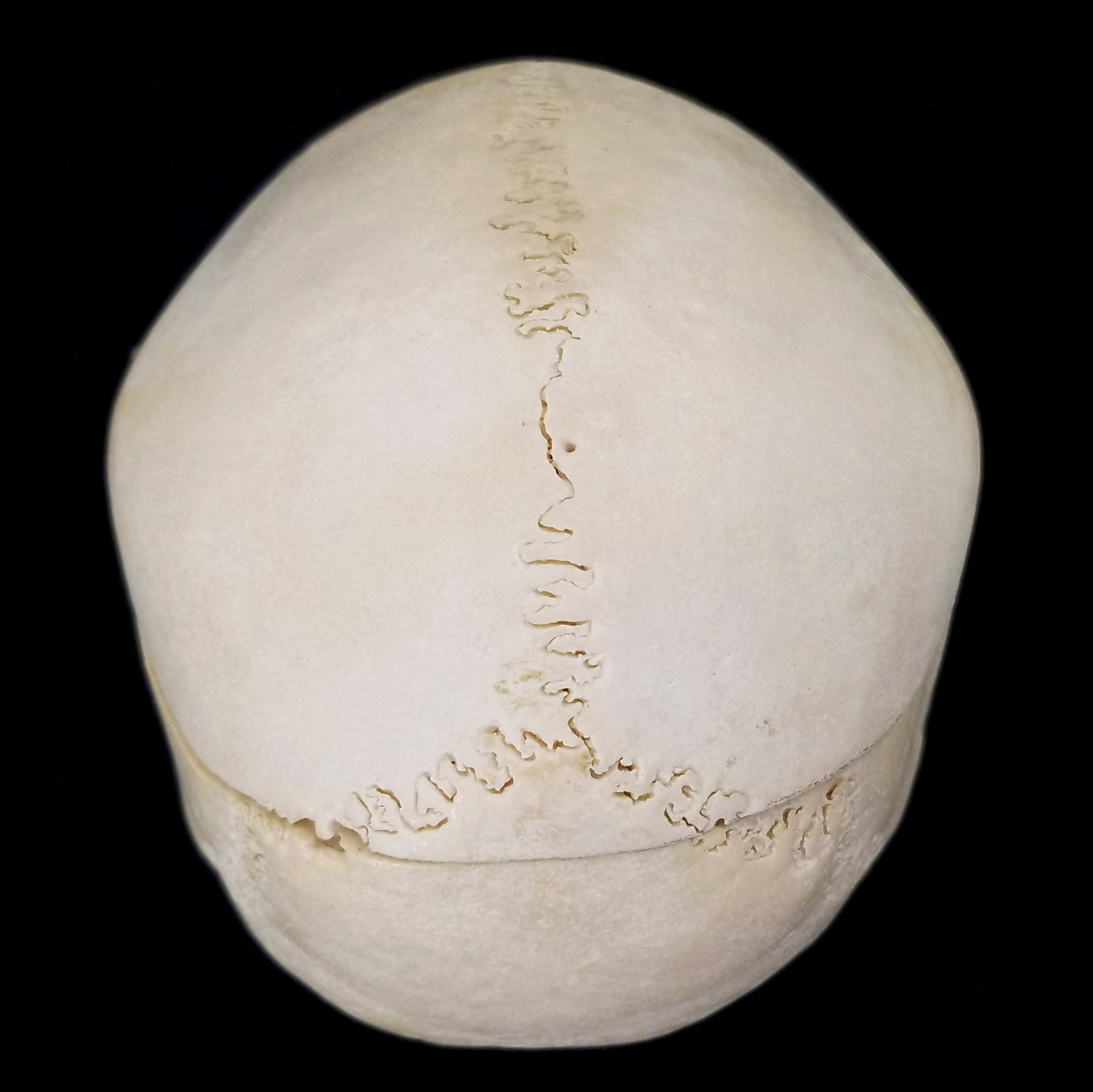 Adult human skull. Suture between parietal foramina is without loops. Posterosuperior view. |