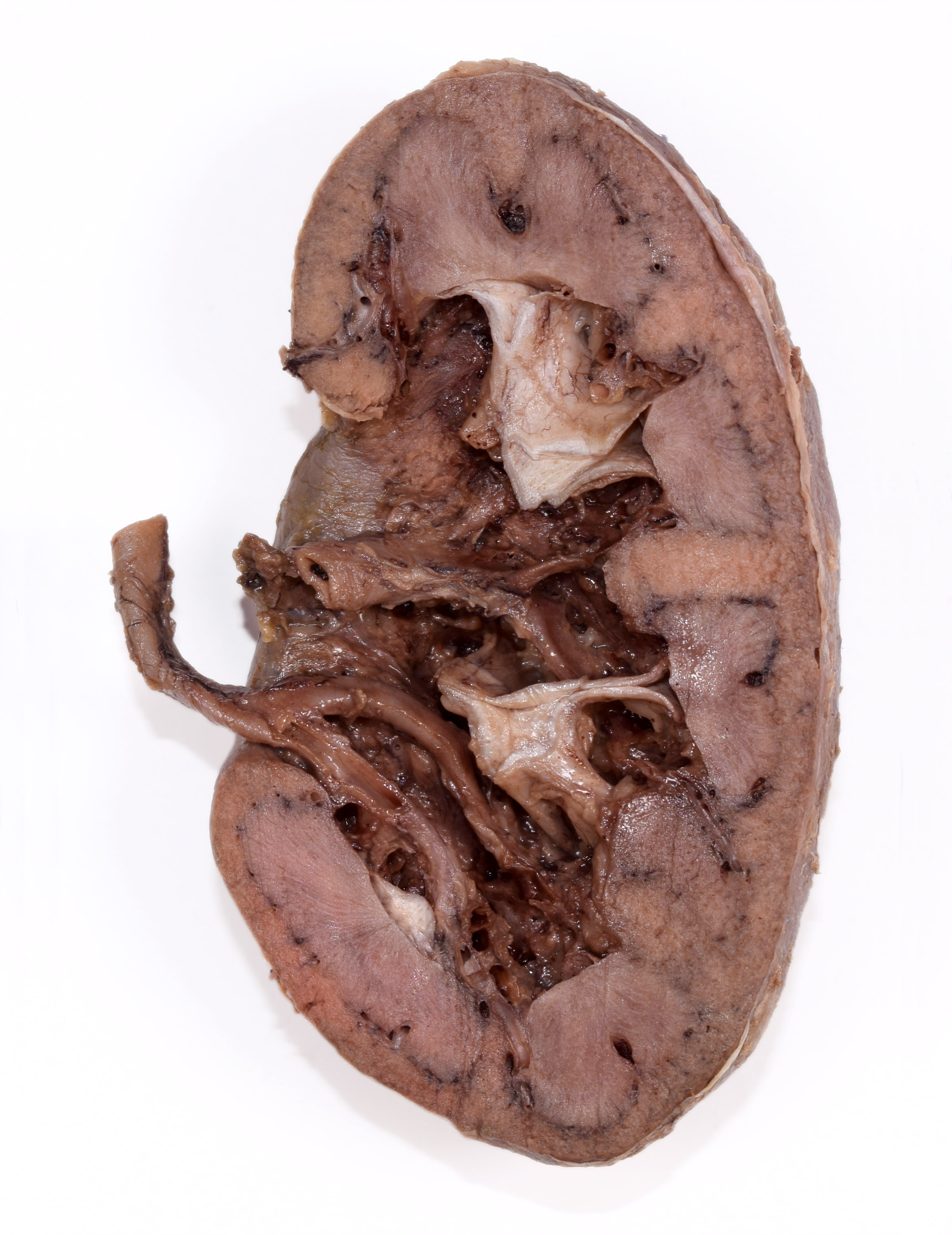 Right kidney from a formalin-embalmed adult human cadaver. Frontal section, anterior portion. Adipose and veins removed. Majority of pelvicalyceal system not retained. |