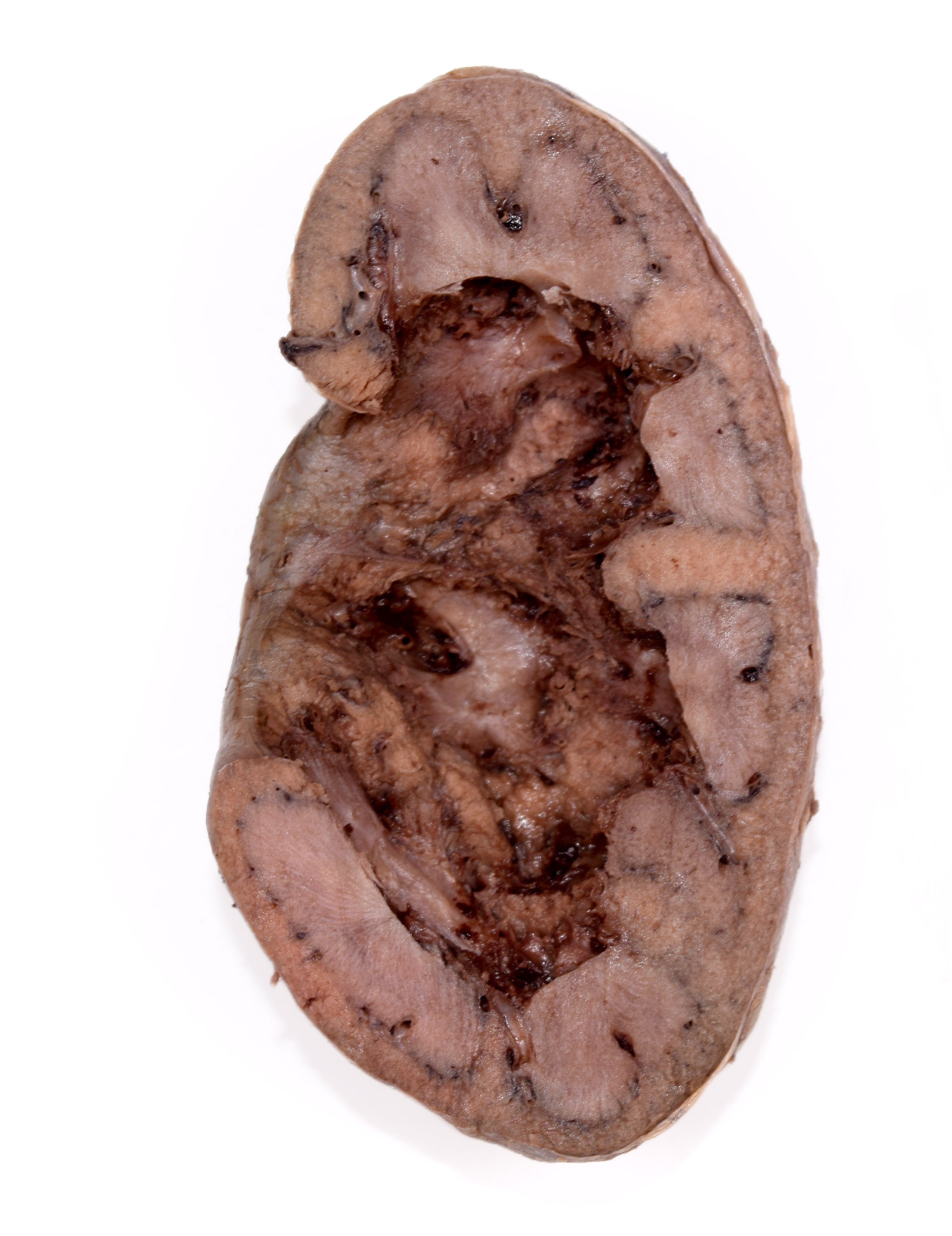 Right kidney from a formalin-embalmed adult human cadaver. Frontal section, anterior portion. Adipose, veins, arteries, and pelvicalyceal system removed. |