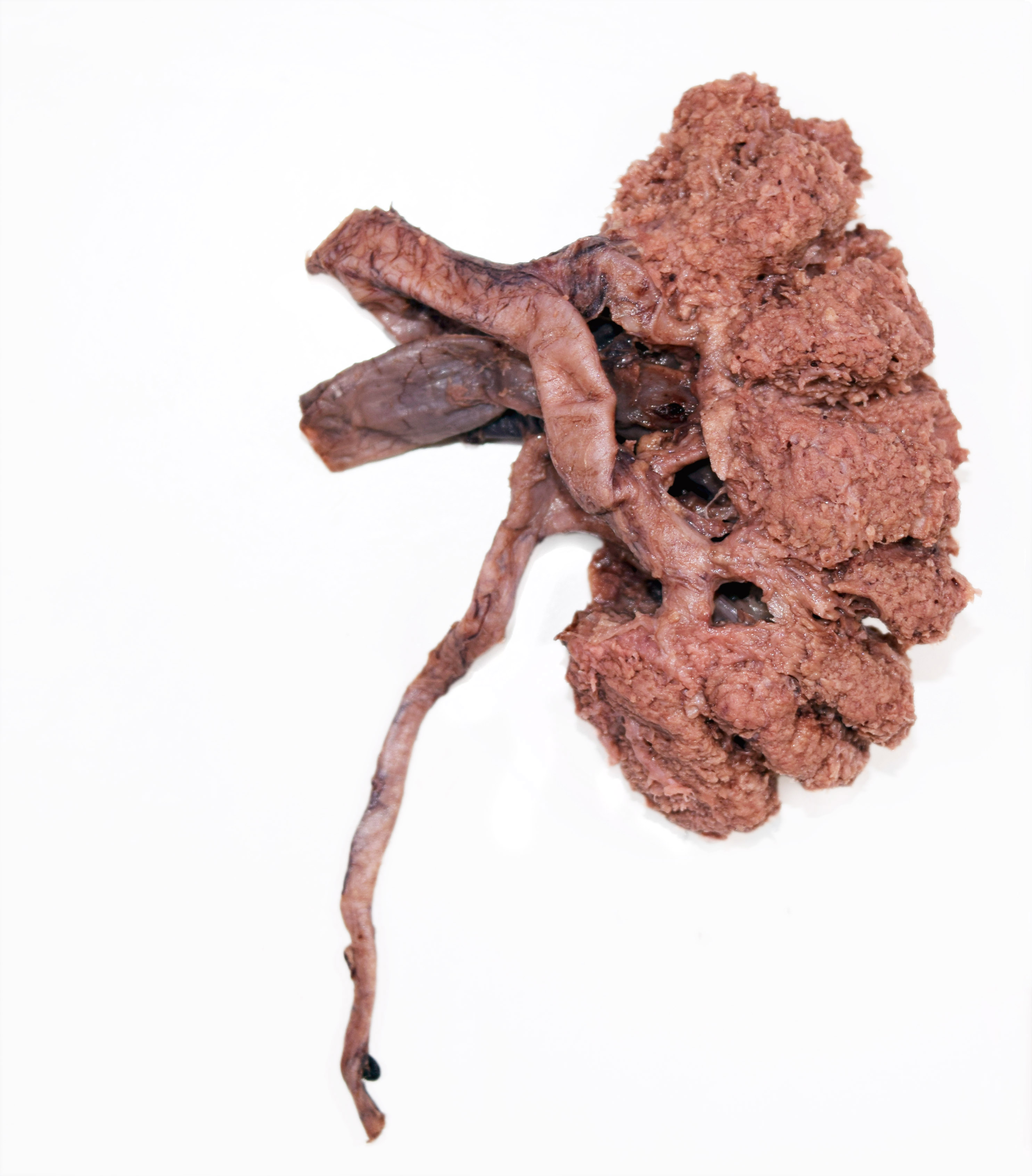Left kidney from a formalin-embalmed adult human cadaver. Anterior view. From top, shows renal artery, renal vein and ureter. Majority of renal cortex removed to reveal renal pyramids. |