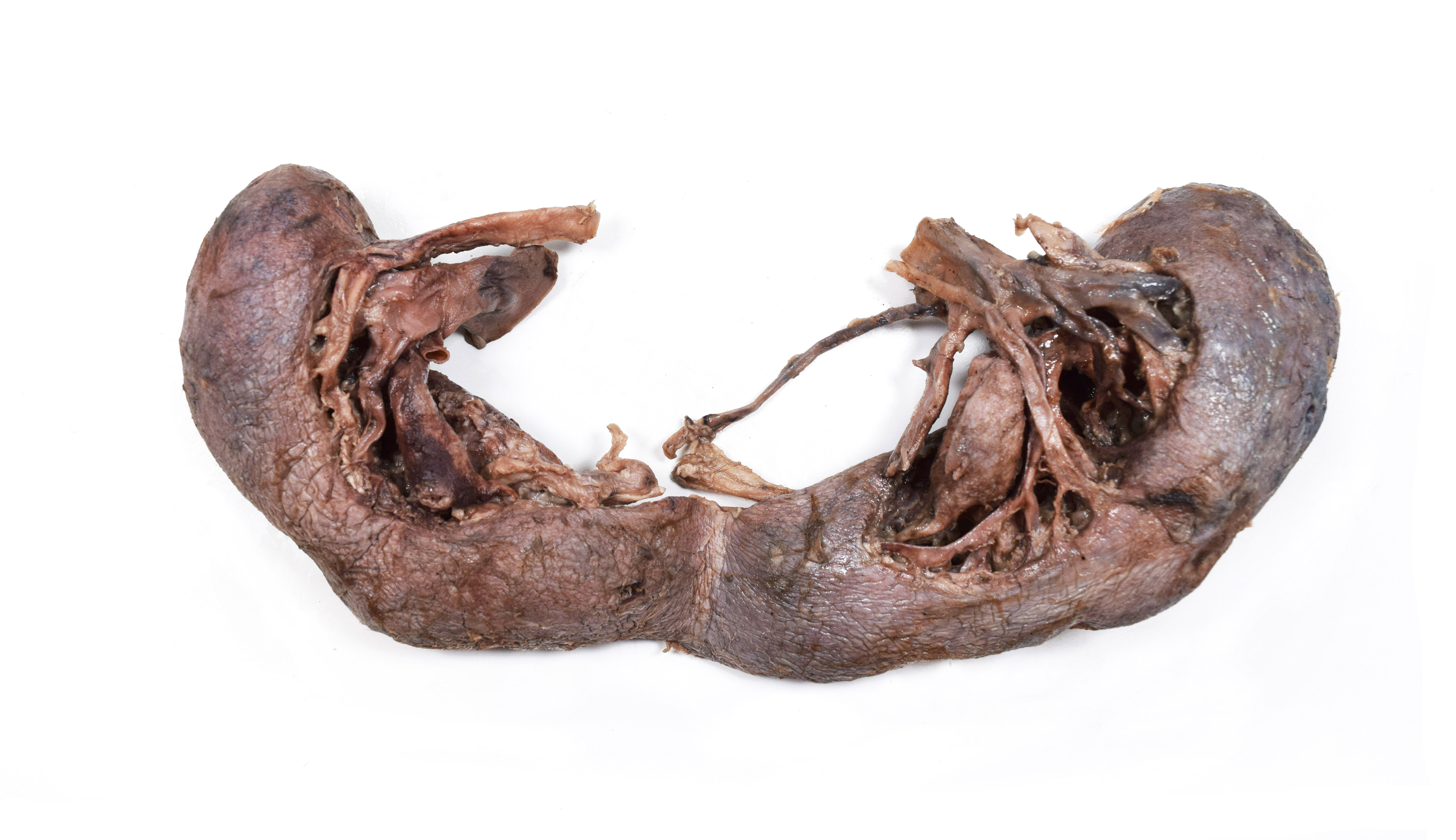 Horseshoe kidney from a formalin-embalmed adult human cadaver. Anterior view. Adipose removed. |
