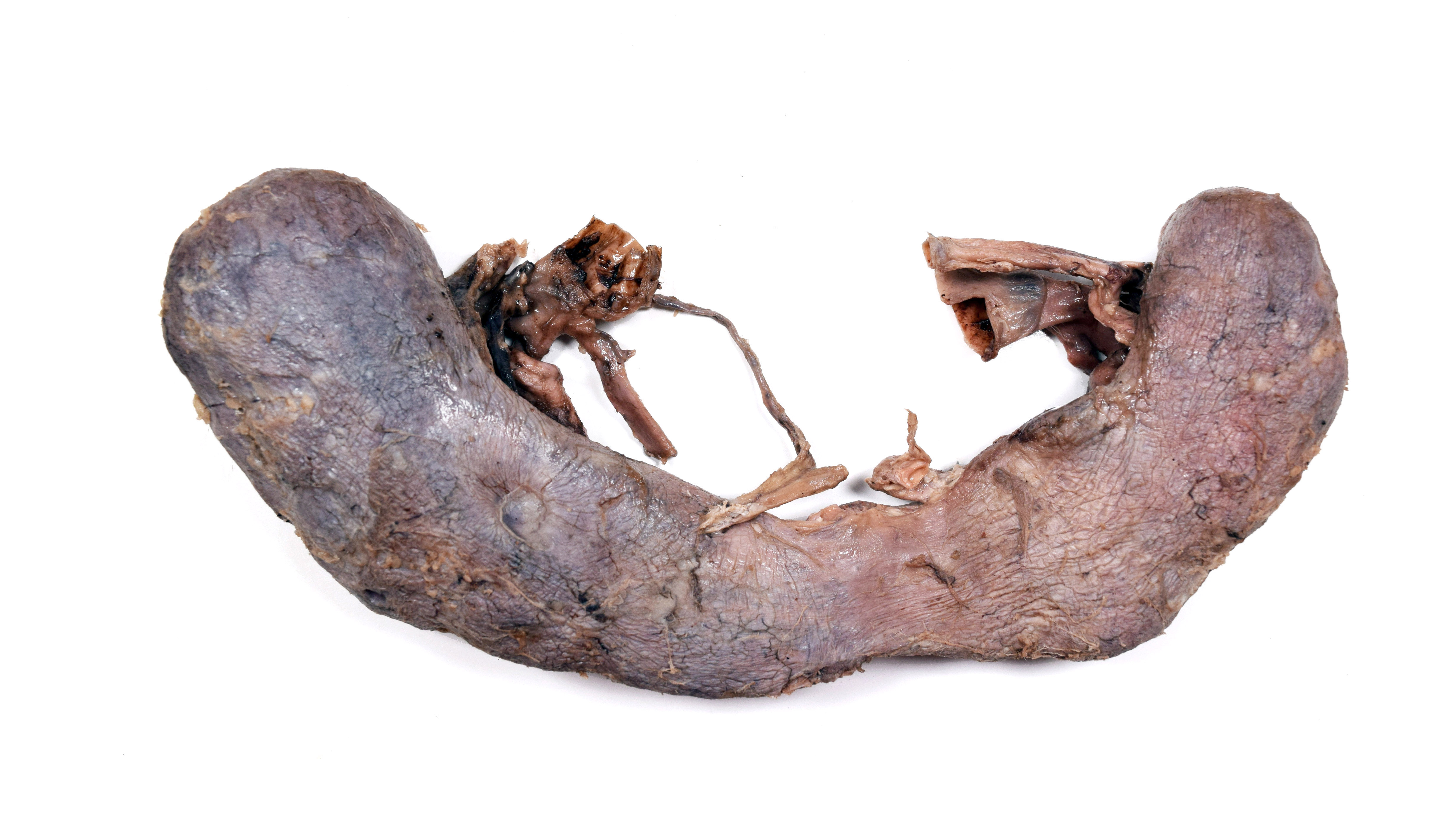 Horseshoe kidney from a formalin-embalmed adult human cadaver. Posterior view. Adipose removed. |