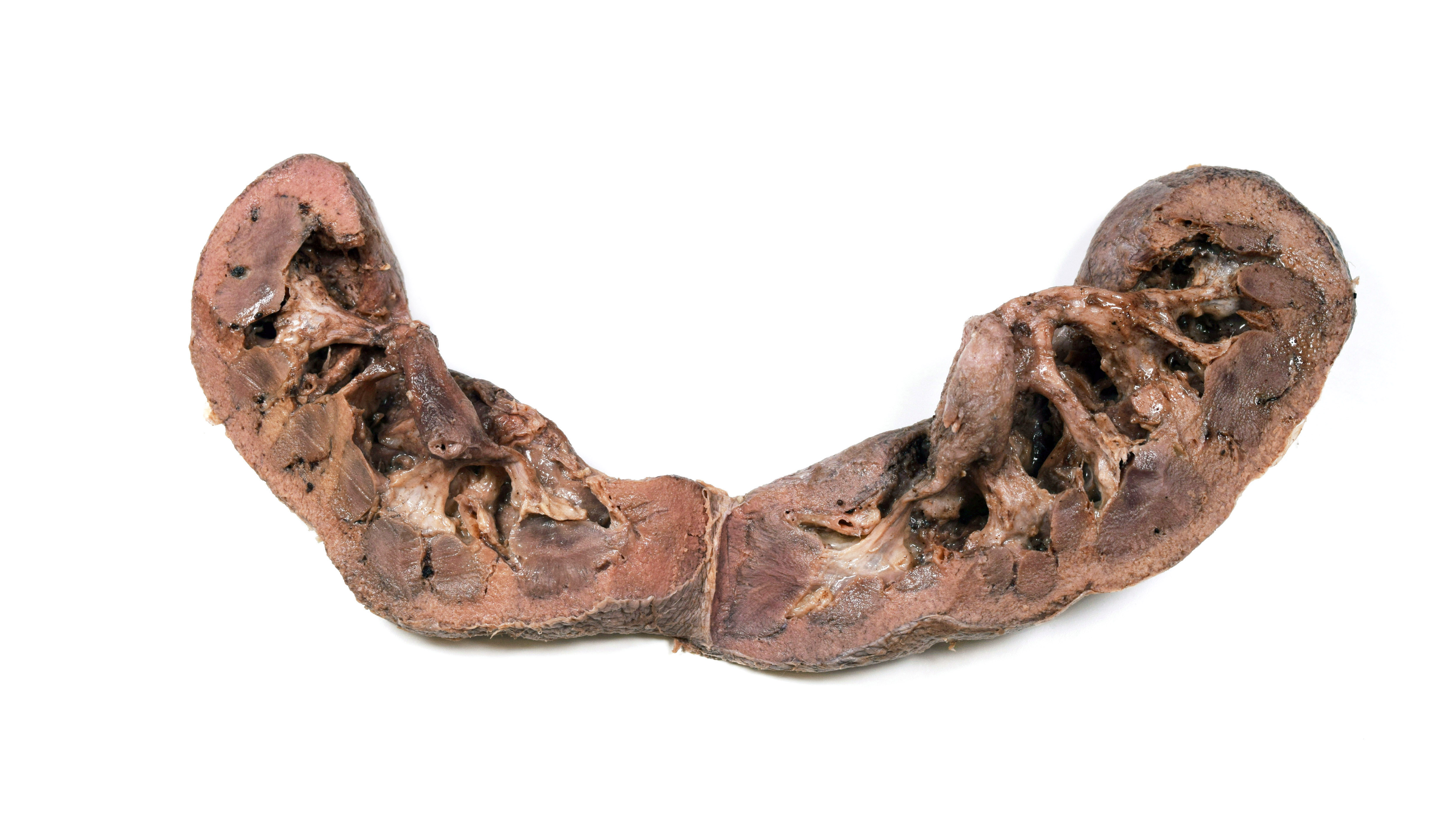 Horseshoe kidney from a formalin-embalmed adult human cadaver. Anterior view. Adipose, renal veins, and renal arteries removed. Portion of anterior parenchyma removed. |