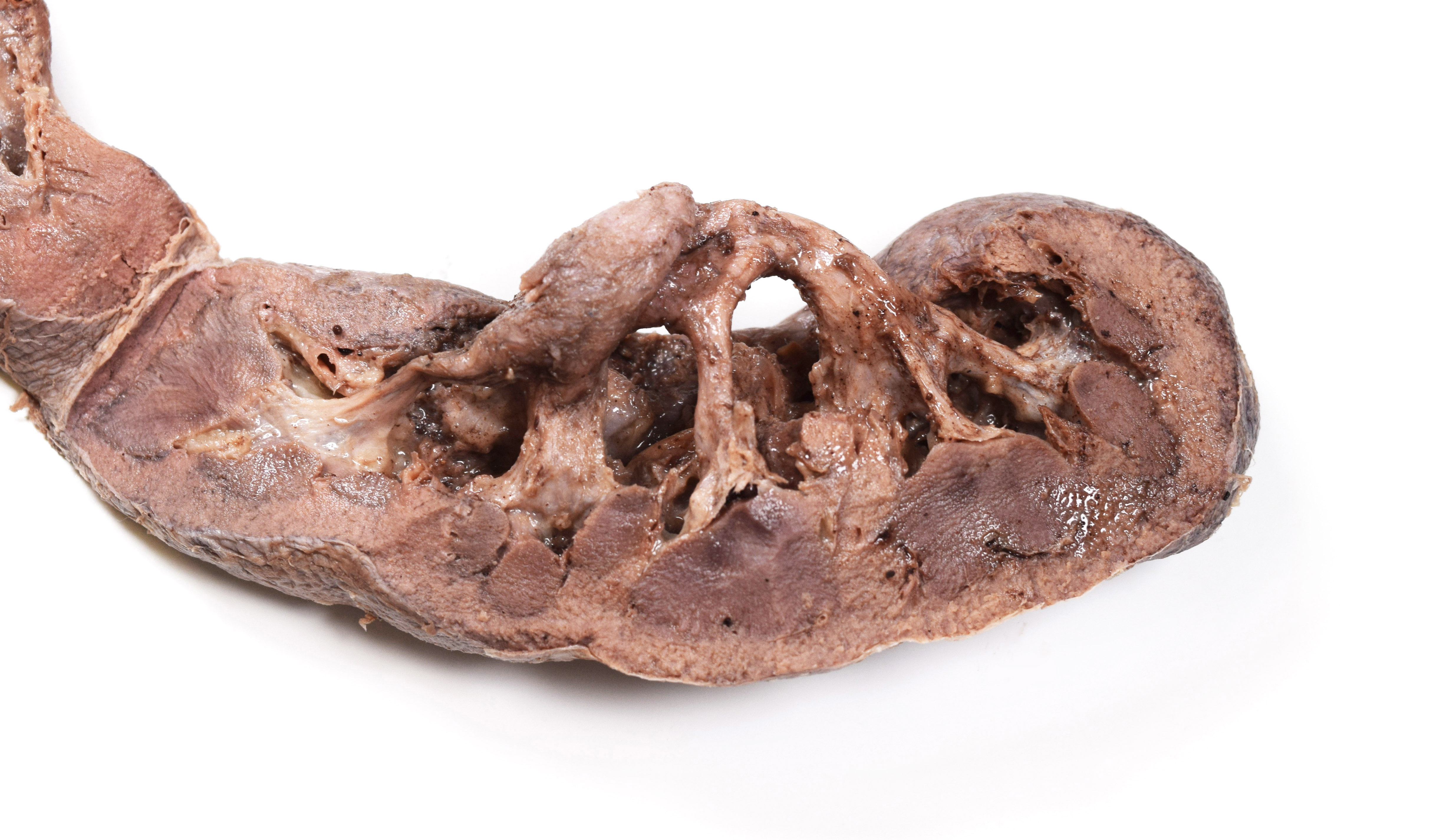 Horseshoe kidney from a formalin-embalmed adult human cadaver. View of left portion. Adipose, renal veins, and renal arteries removed. Portion of anterior parenchyma removed. |