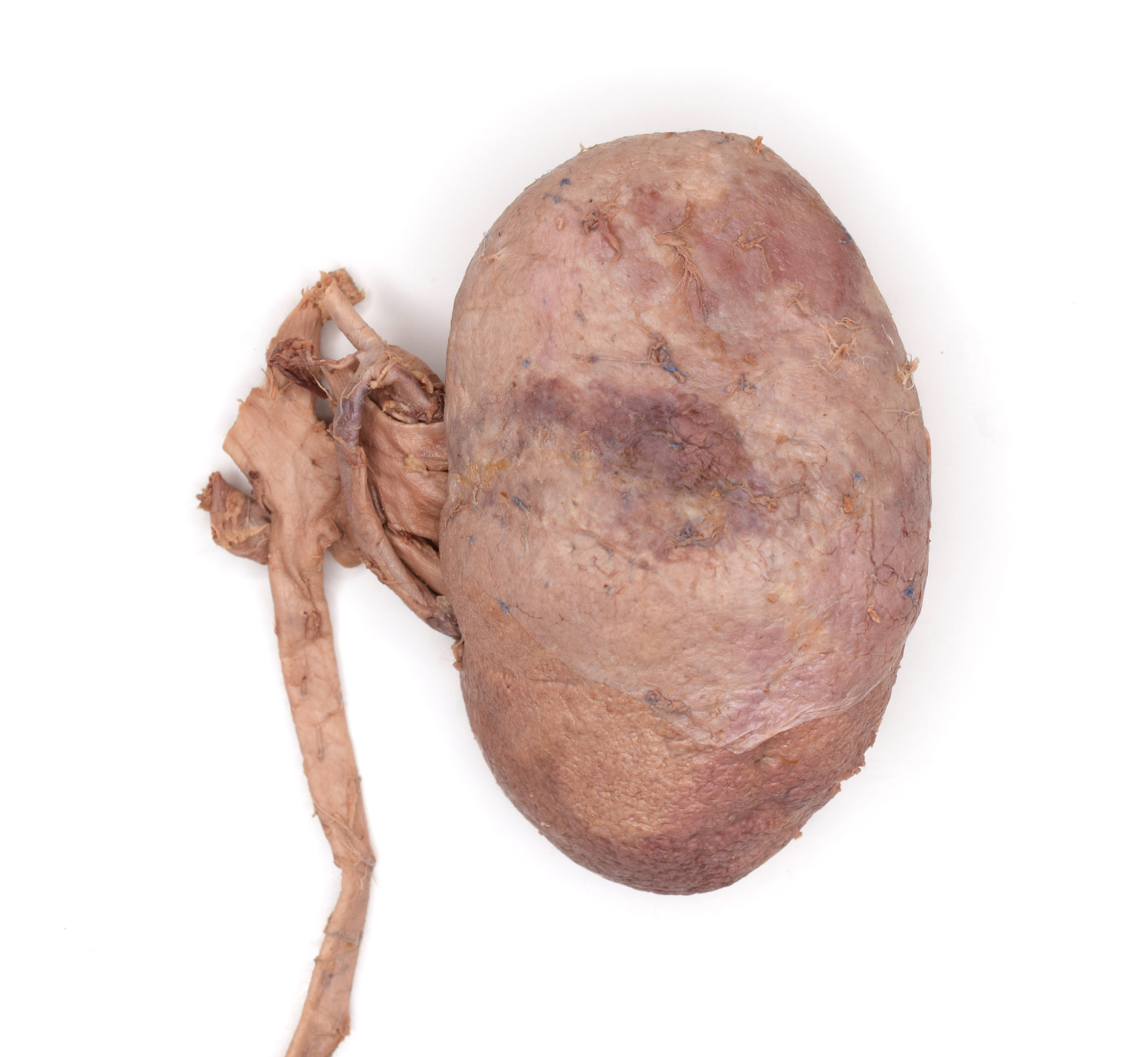 Left kidney from a formalin-embalmed adult human cadaver. Anterior view. Adipose and ureter removed. Left gonadal vein retained. Renal capsule removed from lower pole. |