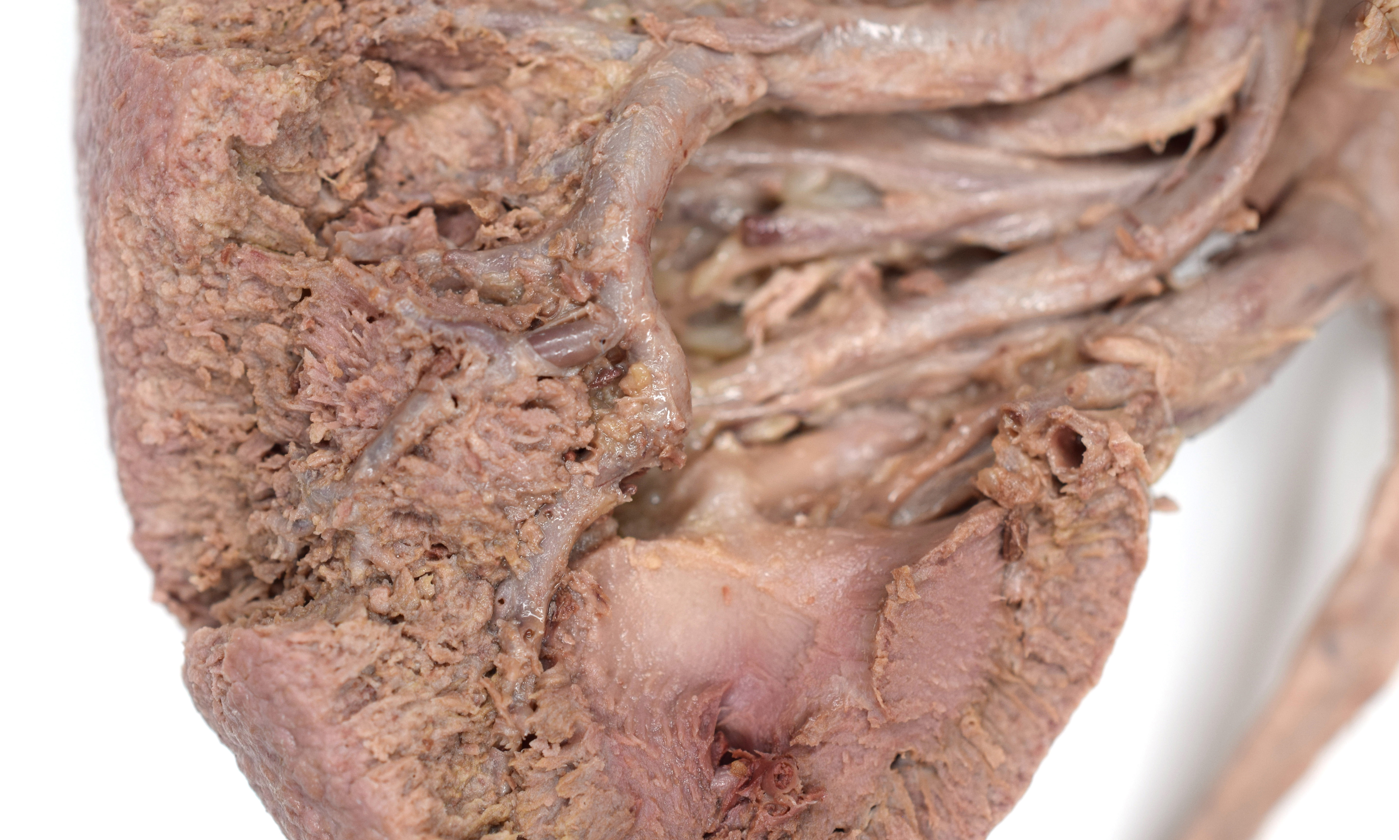 Left kidney from a formalin-embalmed adult human cadaver. Posterior view with portion of posterior parenchyma removed. Adipose and pelvicalyceal system removed. |