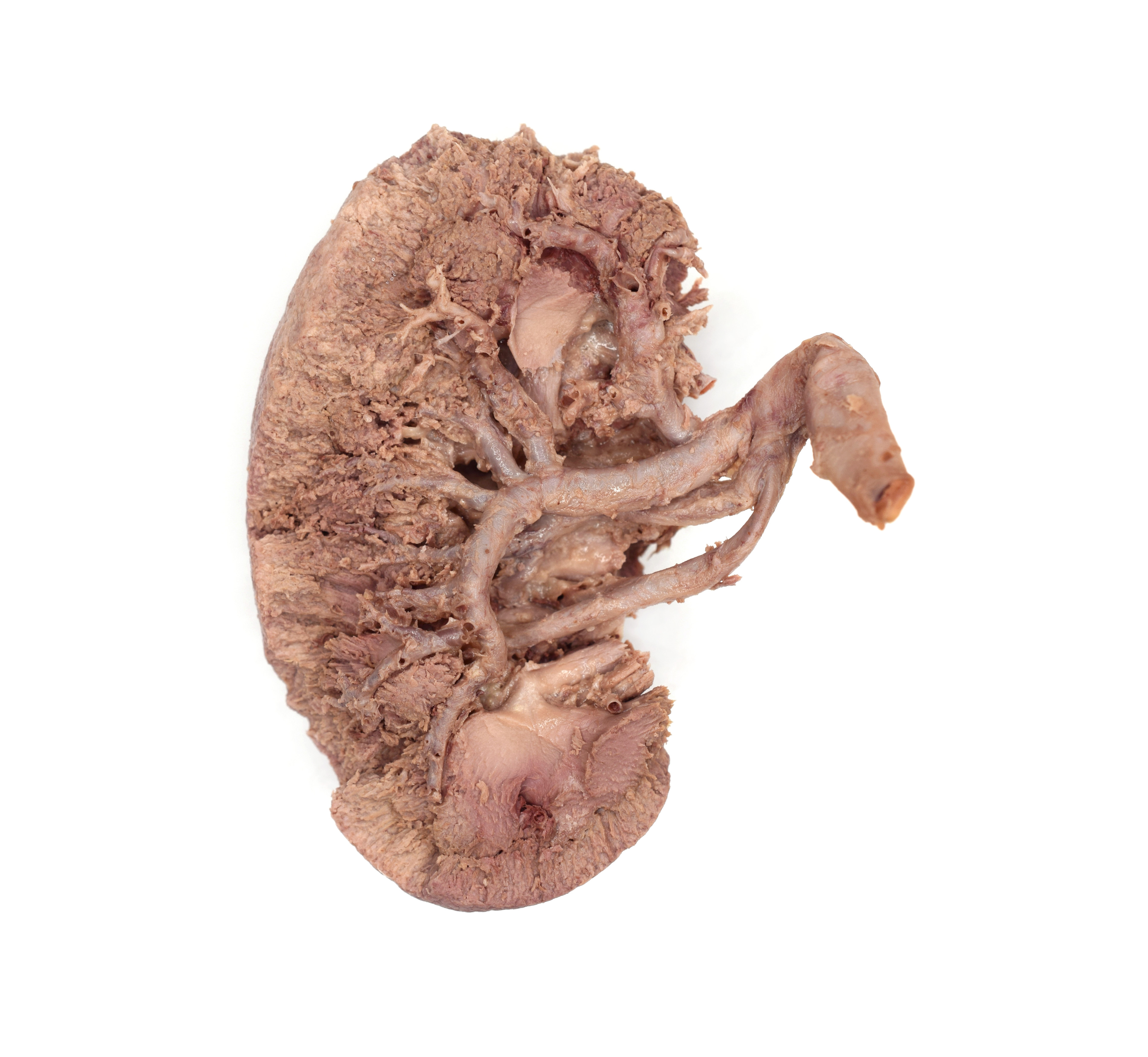 Left kidney from a formalin-embalmed adult human cadaver. Posterior view with posterior parenchyma removed. Adipose, renal vein, and pelvicalyceal system removed. |