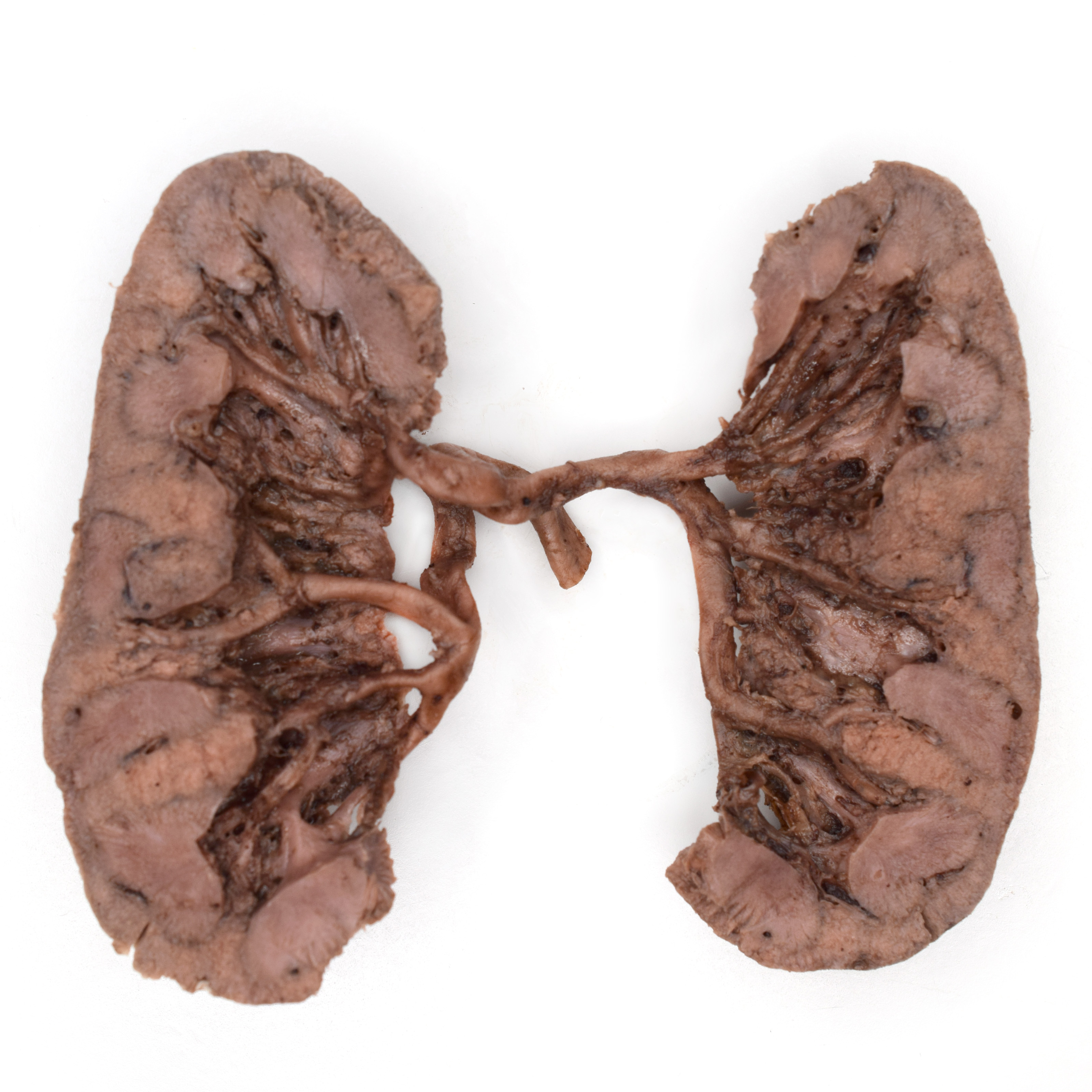 Left kidney from a formalin-embalmed adult human cadaver. Frontal section. Adipose, renal vein and pelvicalyceal system removed. |