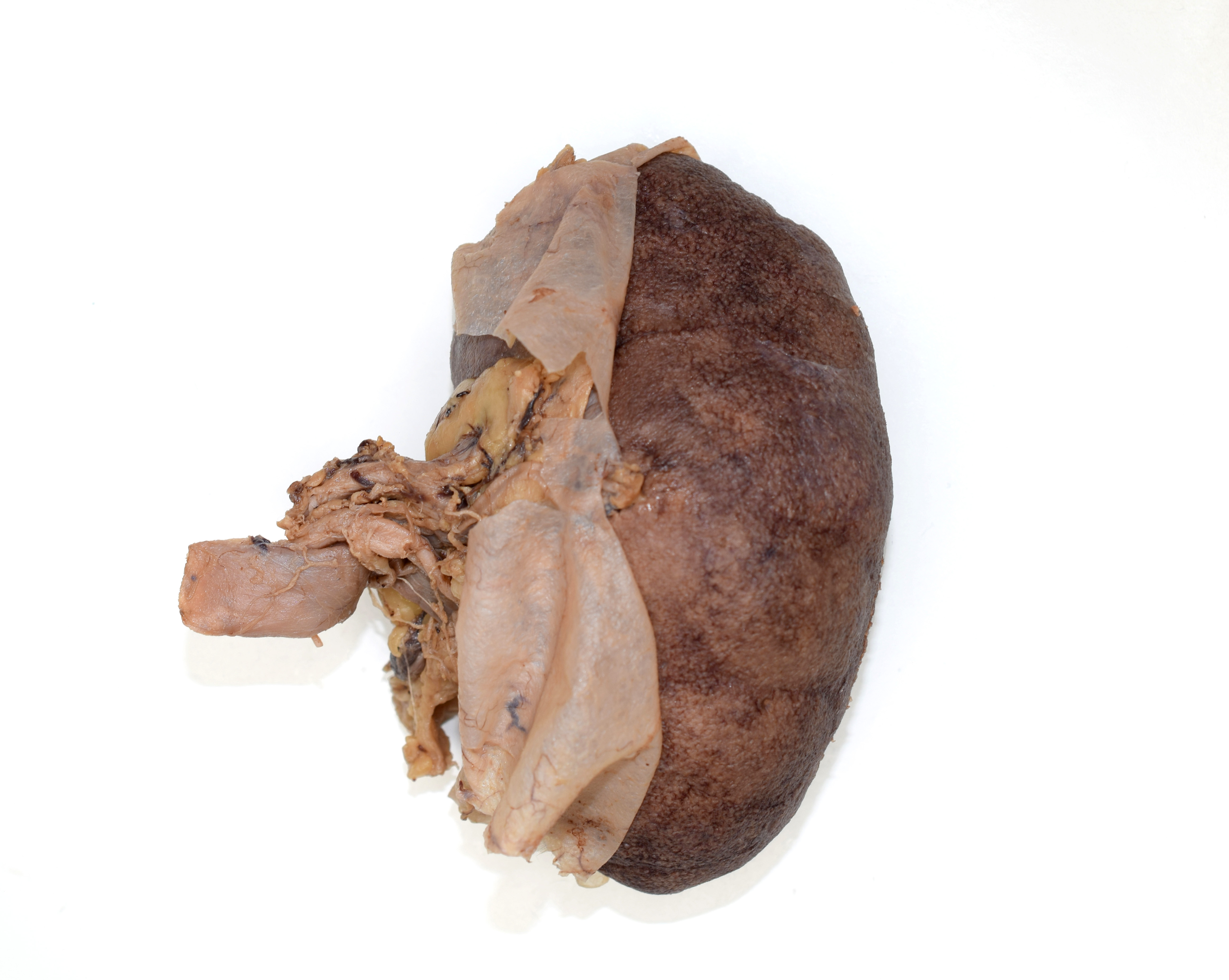 Left kidney from a formalin-embalmed adult human cadaver. Anterior view. Renal capsule reflected |