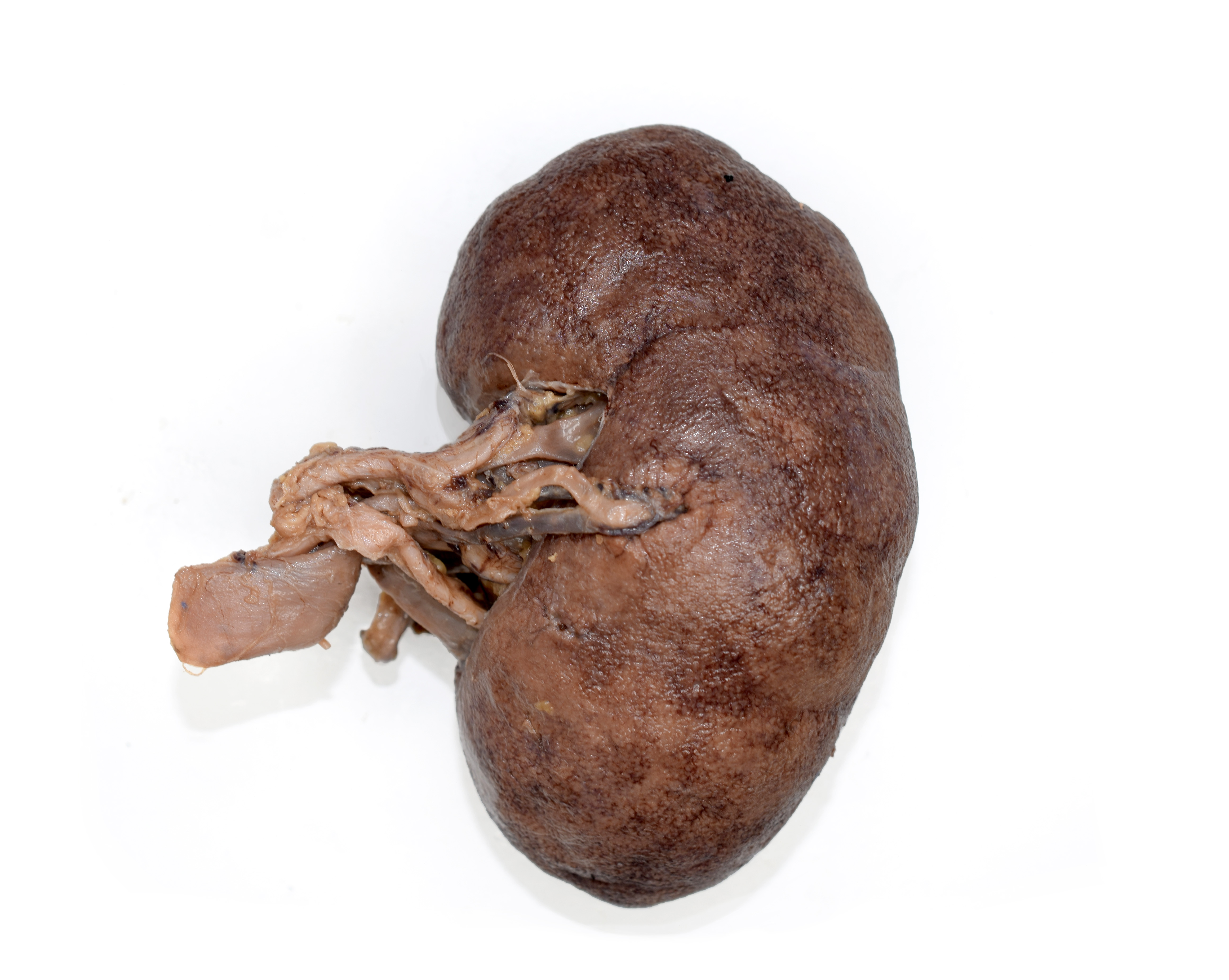 Left kidney from a formalin-embalmed adult human cadaver. Anterior view. Renal capsule and adipose removed. |