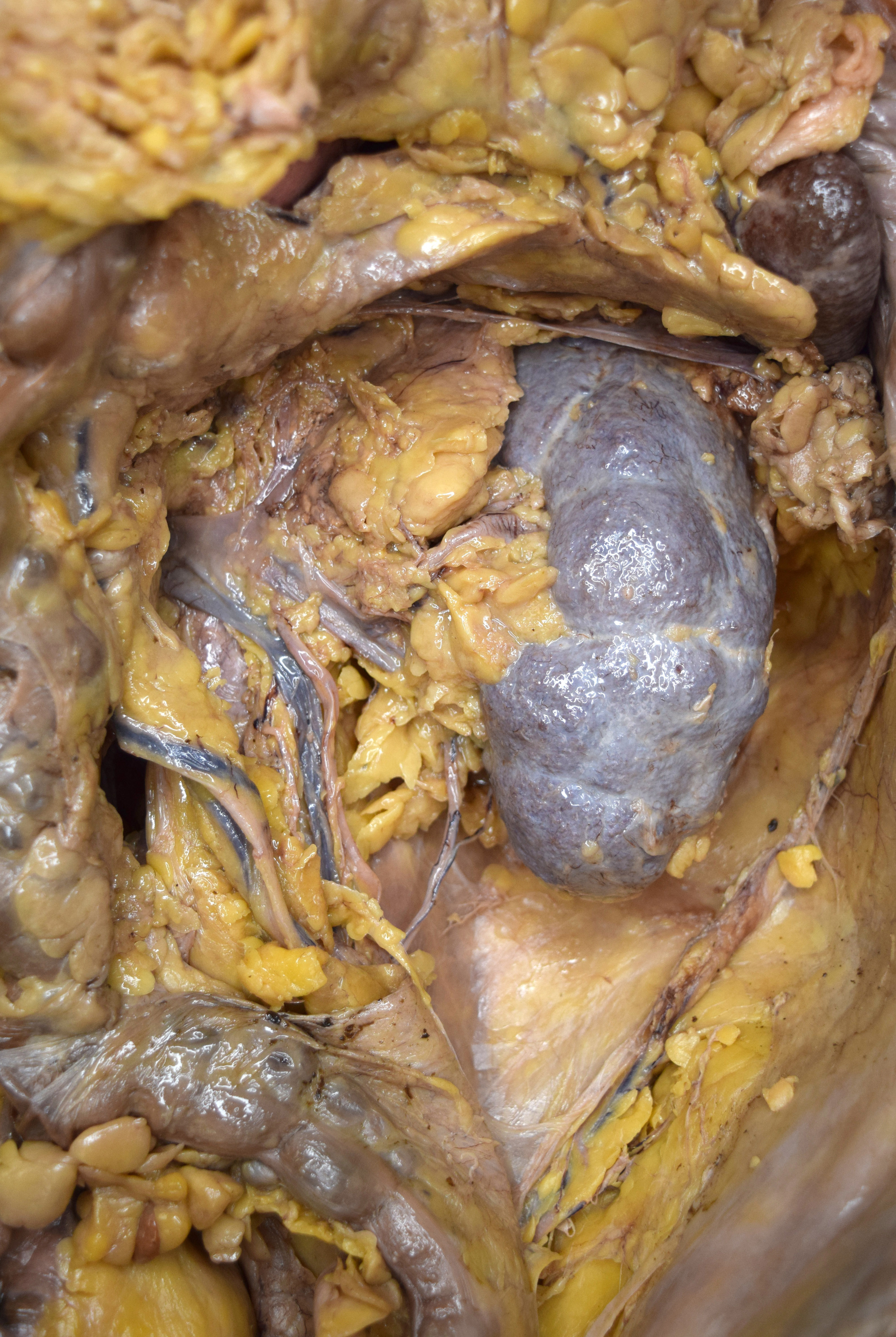 Left kidney exposed in the retroperitoneal space of a formalin-embalmed human adult cadaver. Perirenal adipose capsule partially removed. Left renal vein visible. |