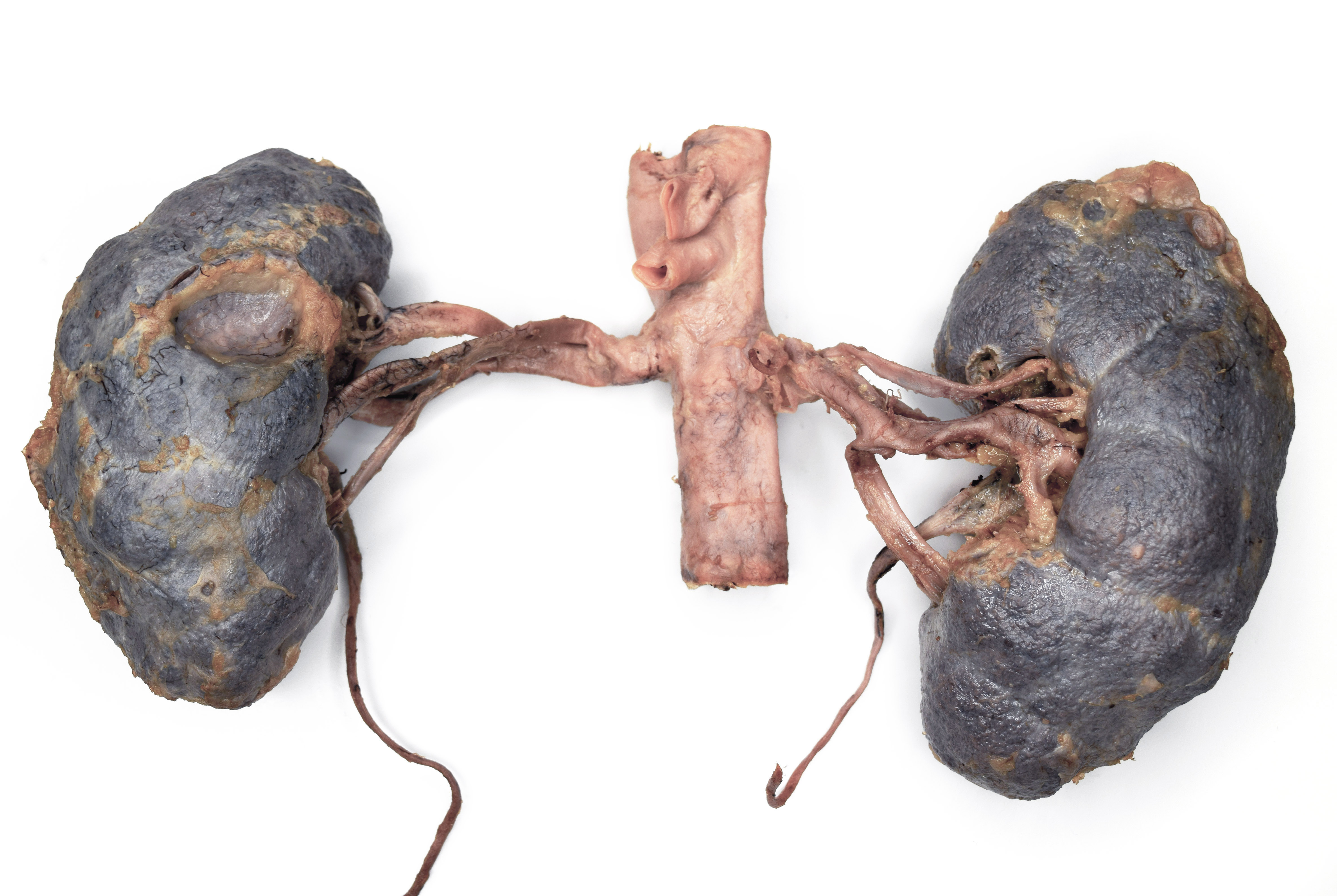 Right kidney, renal arteries, aorta, and left kidney from a formalin-embalmed human adult cadaver. Anterior view. From top of aorta section, celiac trunk, superior mesenteric artery, and bilateral renal arteries present. Ureters retained. |