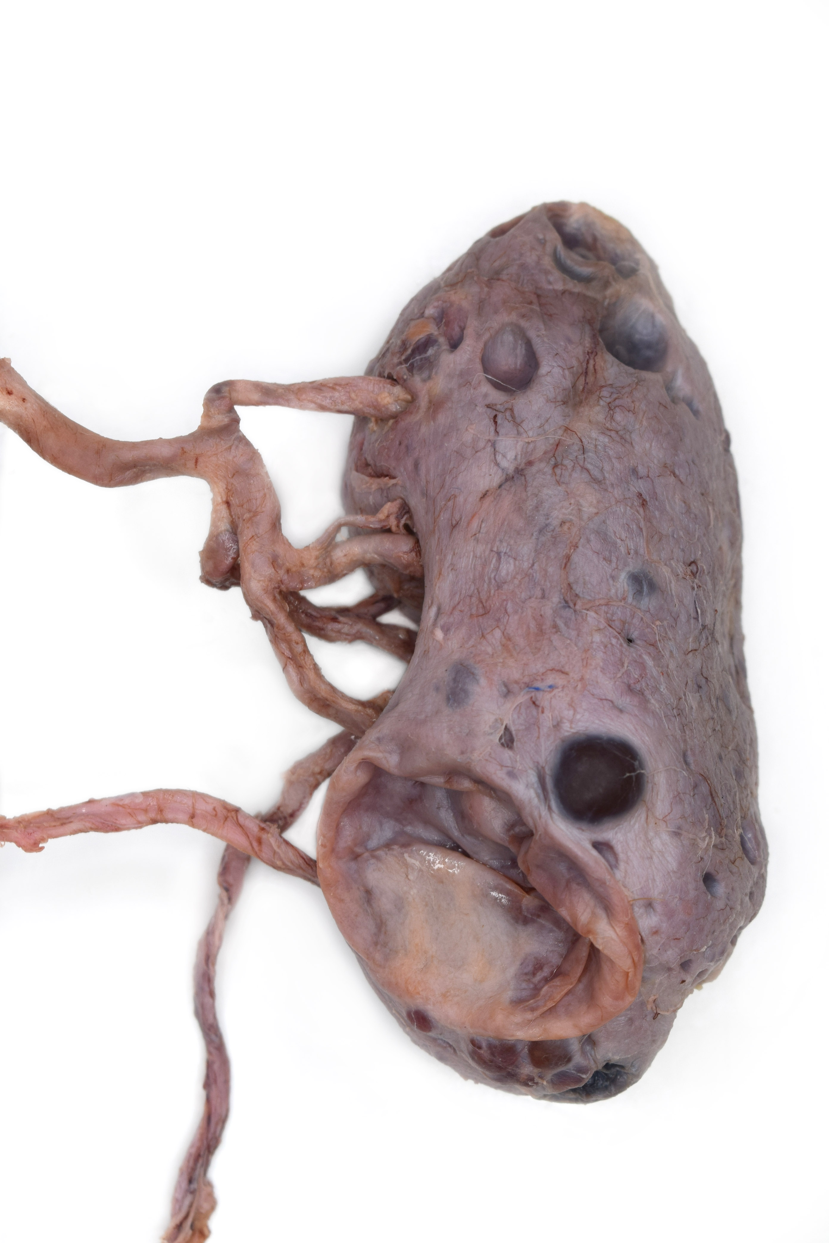Left kidney from a formalin-embalmed adult human cadaver. Anterior view. Renal vein and adipose removed. Numerous cysts visible. |
