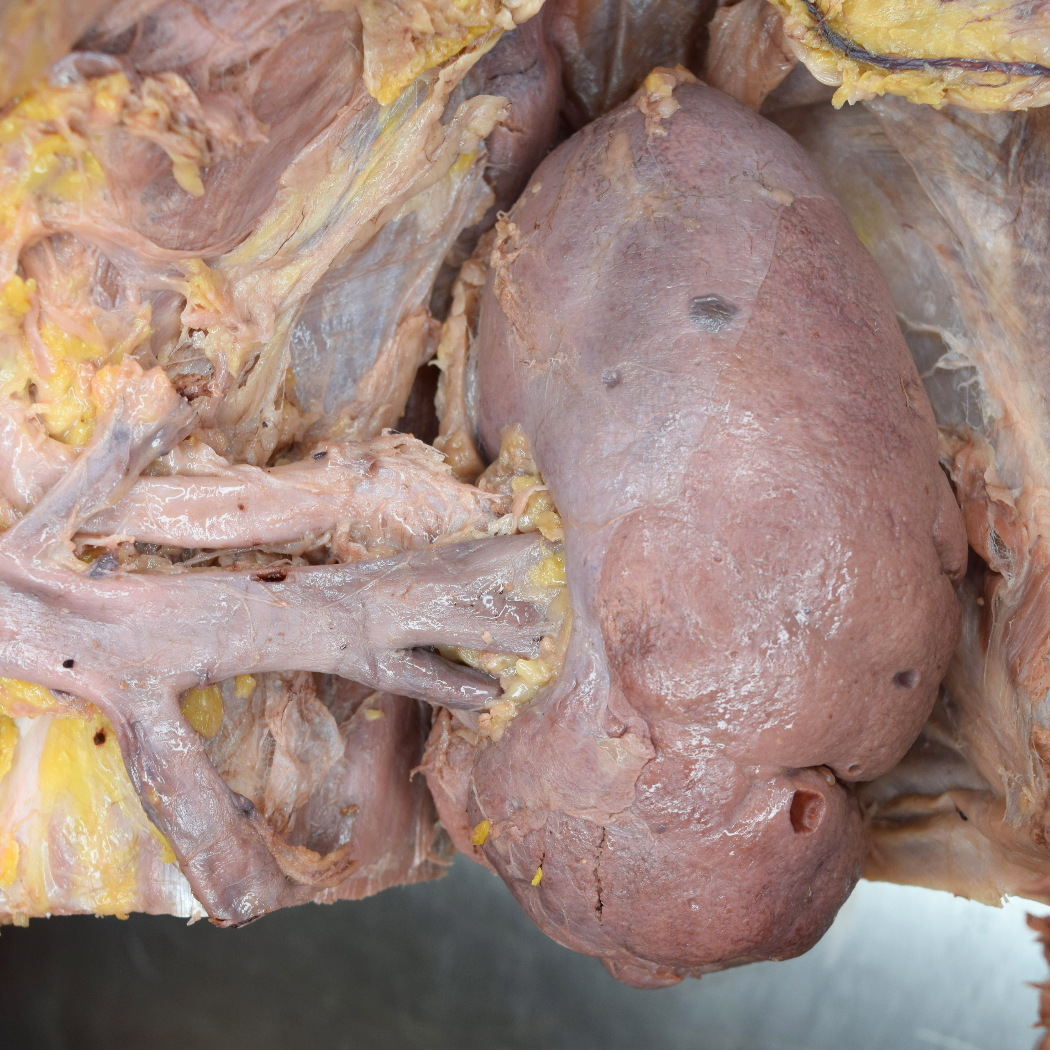 Left kidney of a formalin-embalmed adult human cadaver. Anterior view. Adipose removed. |