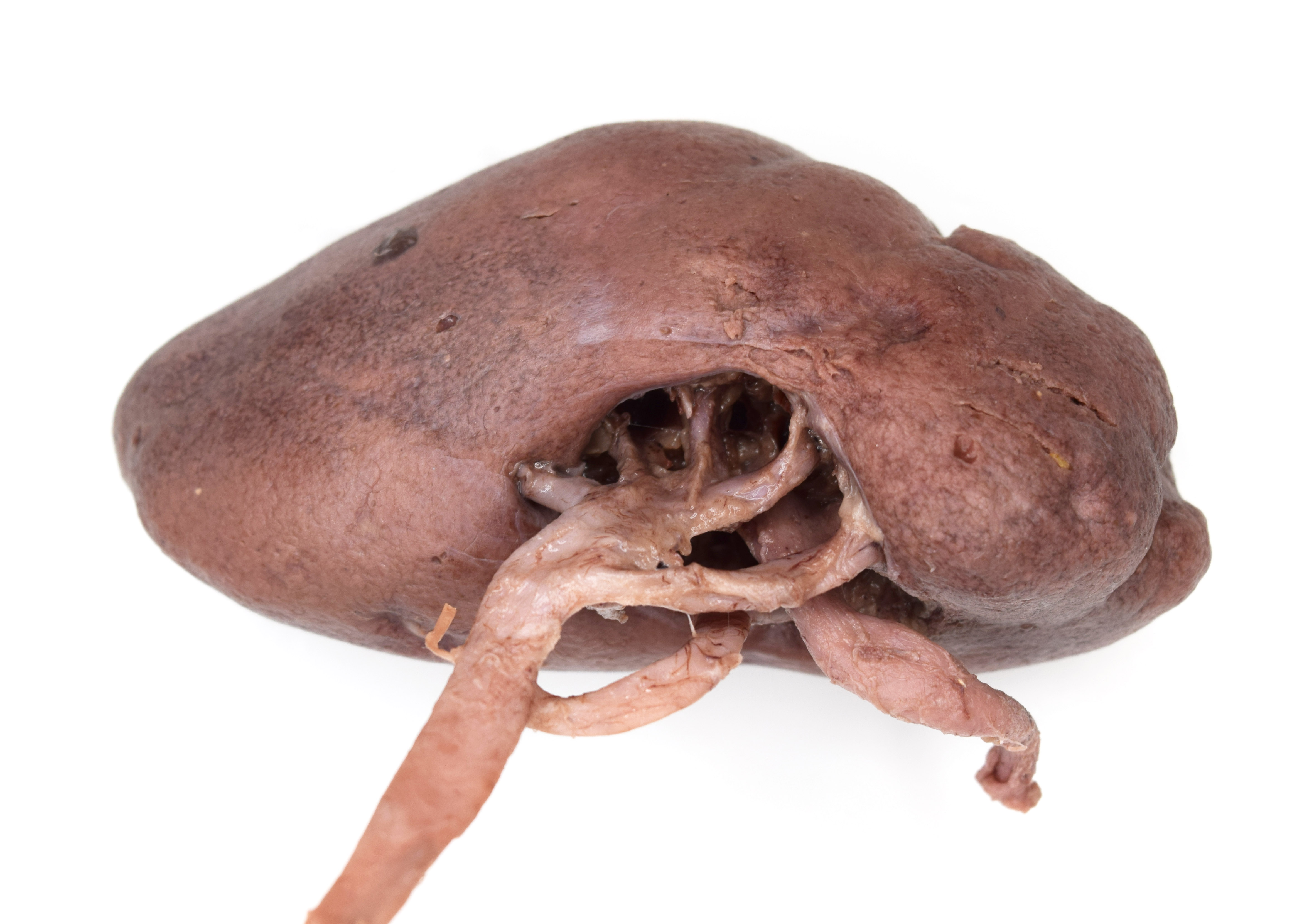 Left kidney from a formalin-embalmed adult human cadaver. View into renal sinus. Renal vein and adipose removed. |