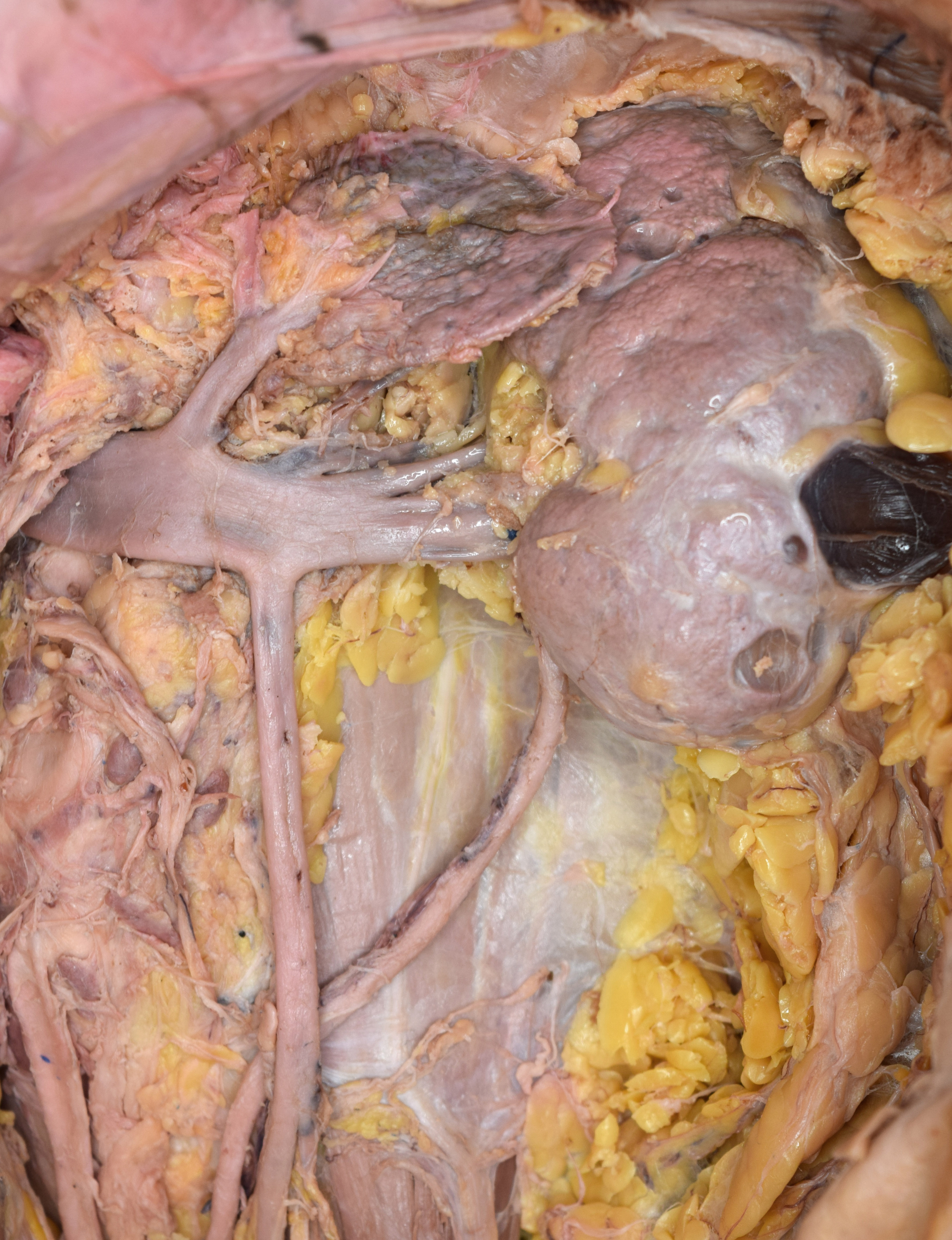 Left kidney exposed in the retroperitoneal space of a formalin-embalmed human adult cadaver. Left gonadal vein, left renal vein, and adrenal gland visible. |