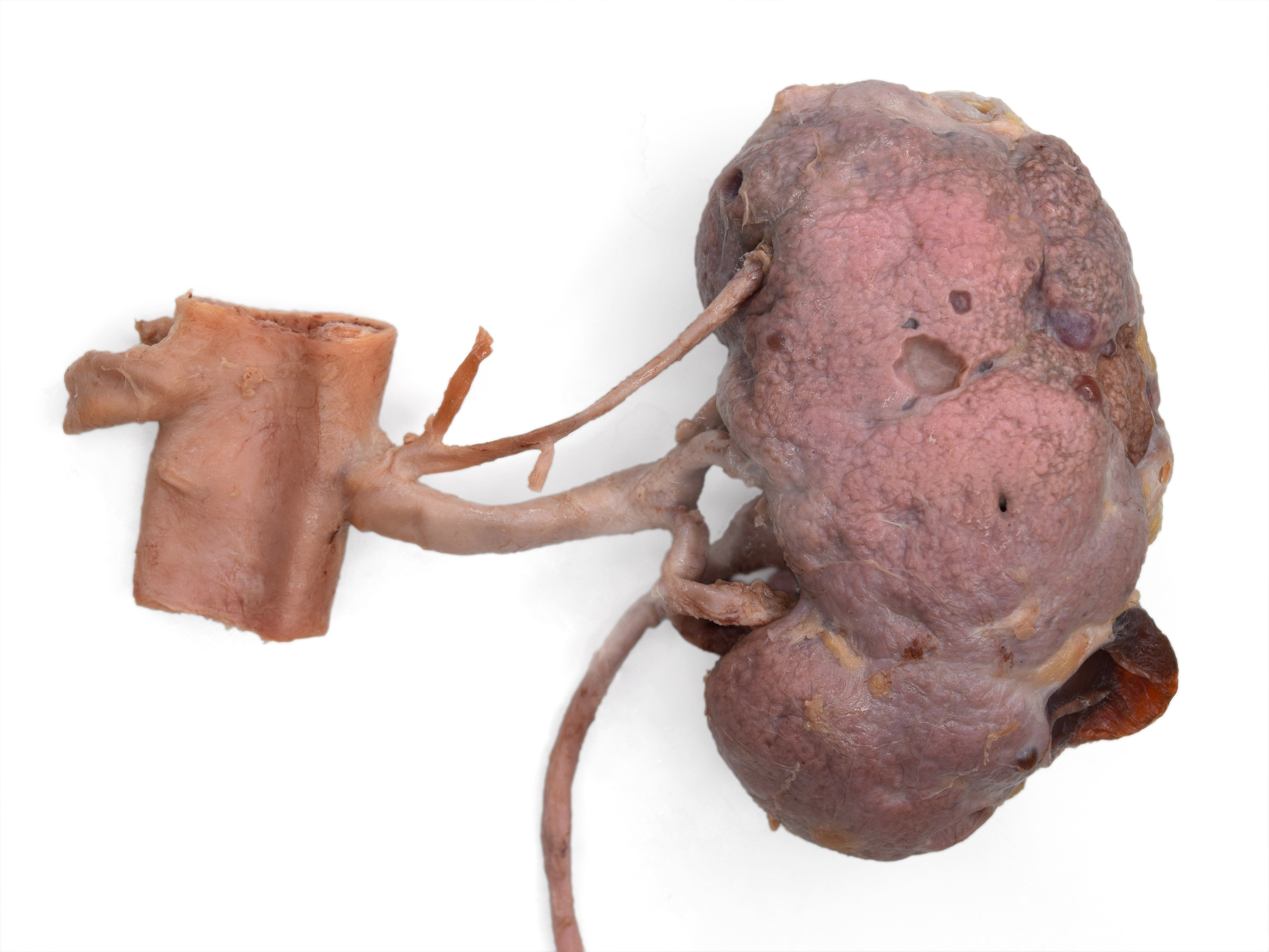 Left kidney with portion of aorta from a formalin-embalmed adult human cadaver. Anterior view. Renal vein and adipose removed. Has extrahilar renal artery at superior pole. Several cysts visible. |