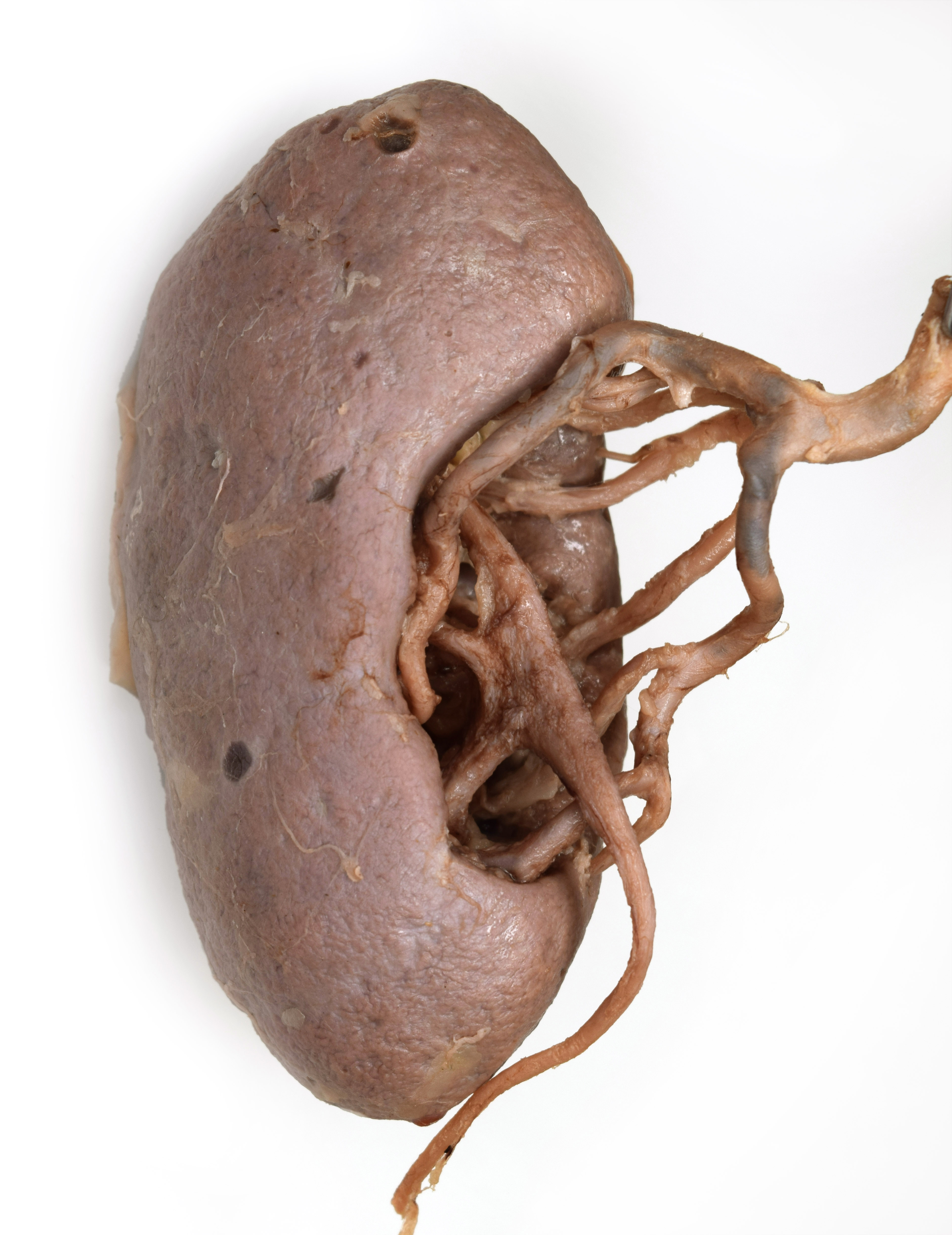 Left kidney of a formalin-embalmed adult human cadaver. Posterior view. Renal vein and adipose removed. |