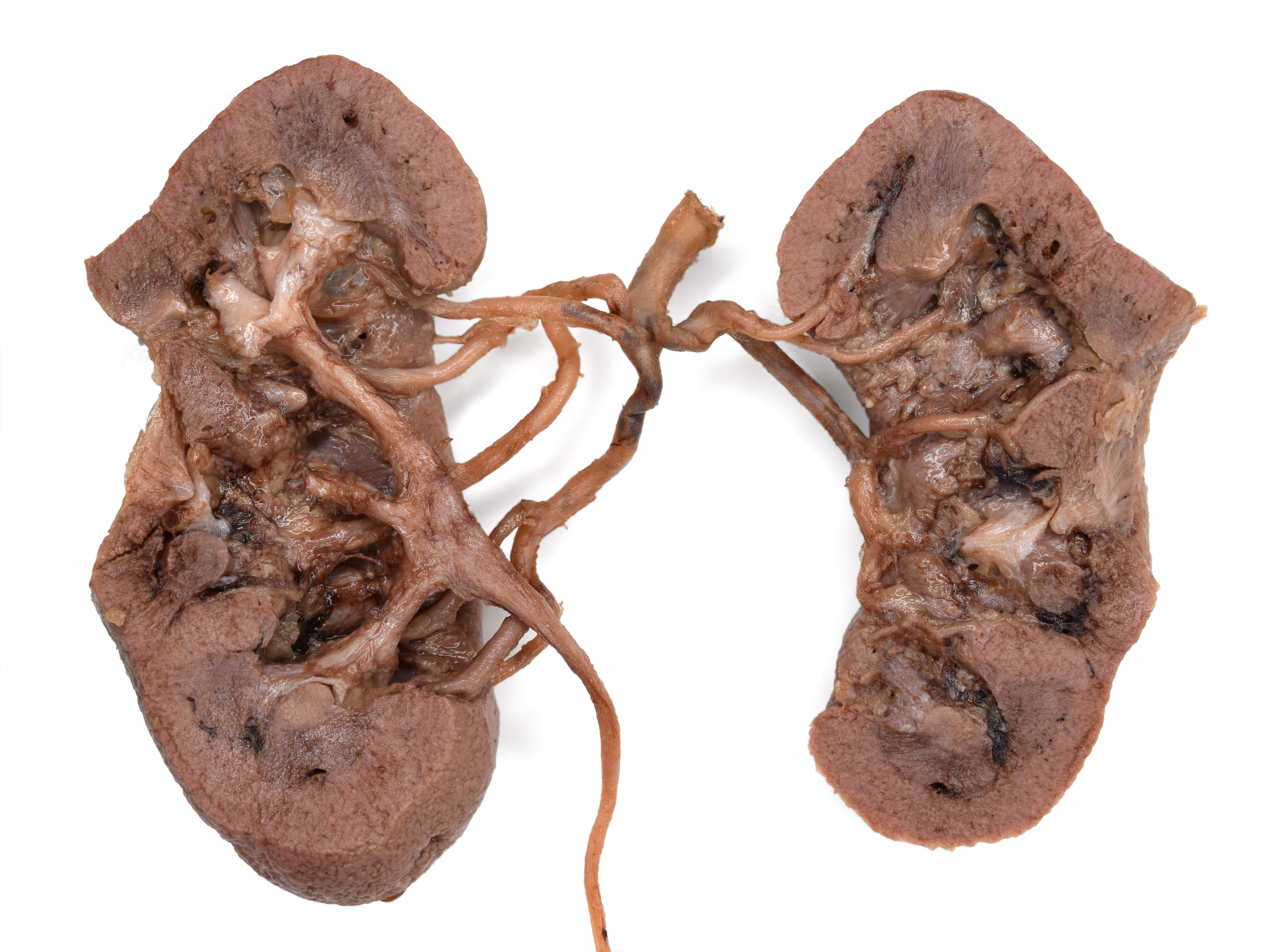 Left kidney of a formalin-embalmed adult human cadaver. Frontal section. Renal vein and adipose removed. Lateral border altered due to cyst. |