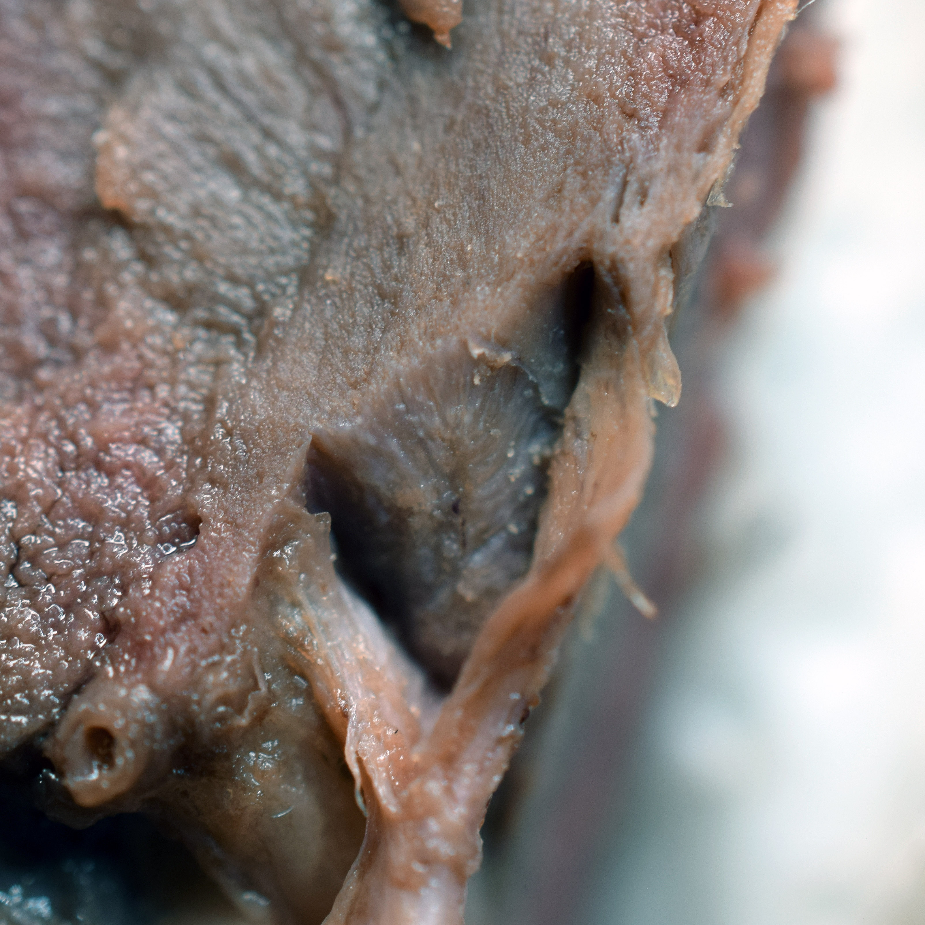 Oblique section through renal pyramid with minor calyx cut to reveal renal papilla. From formalin-embalmed kidney of adult human cadaver. |