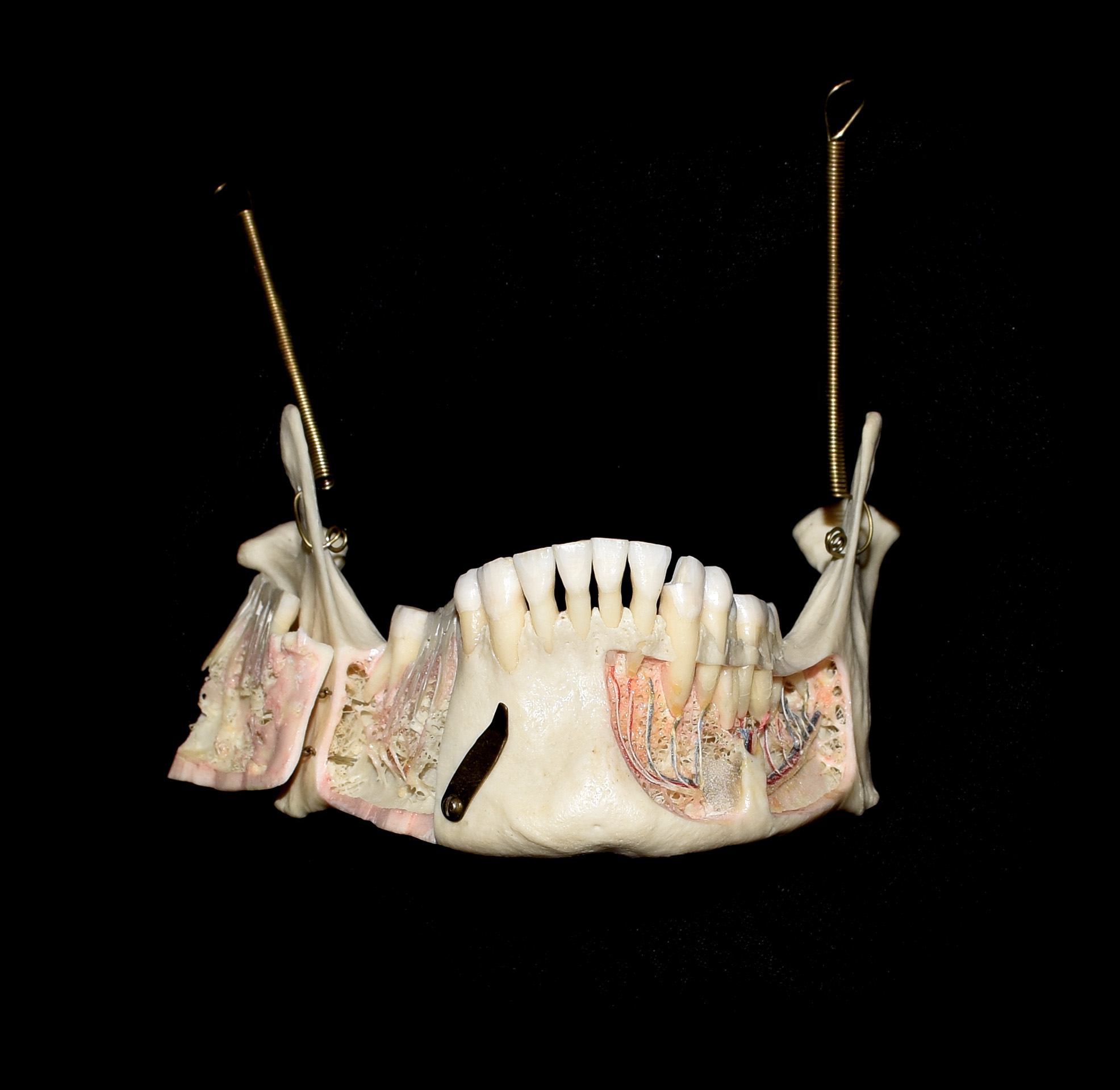 Mandible of adult human skull. Anterior view. Lateral regions dissected. |
