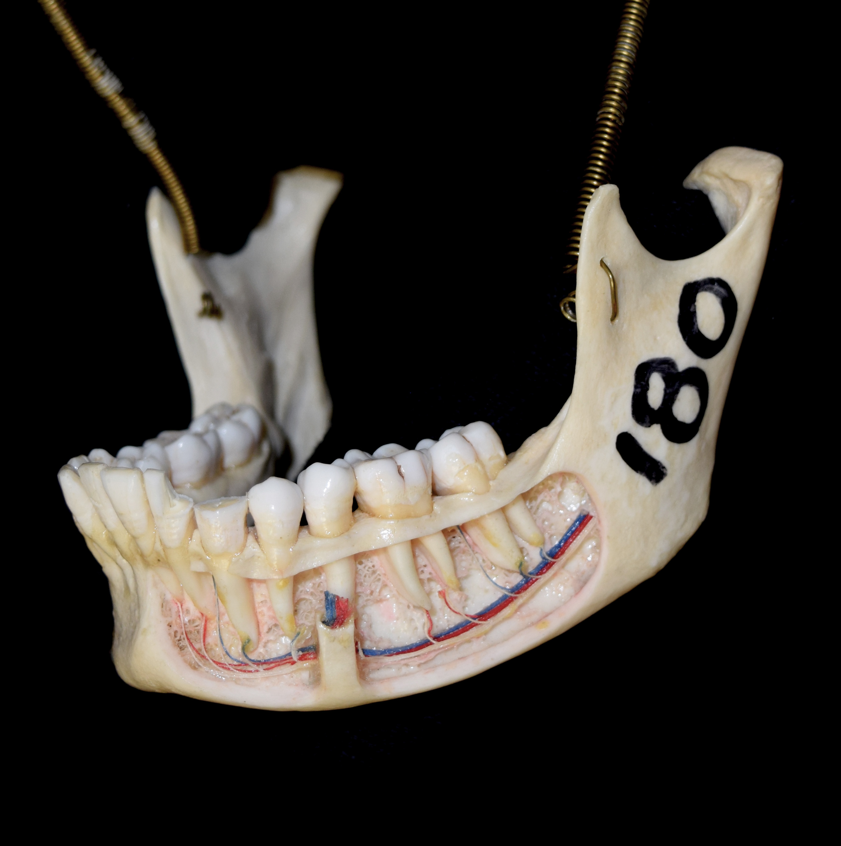 Mandible of adult human skull. Left anterolateral view. Dissected to reveal teeth. |