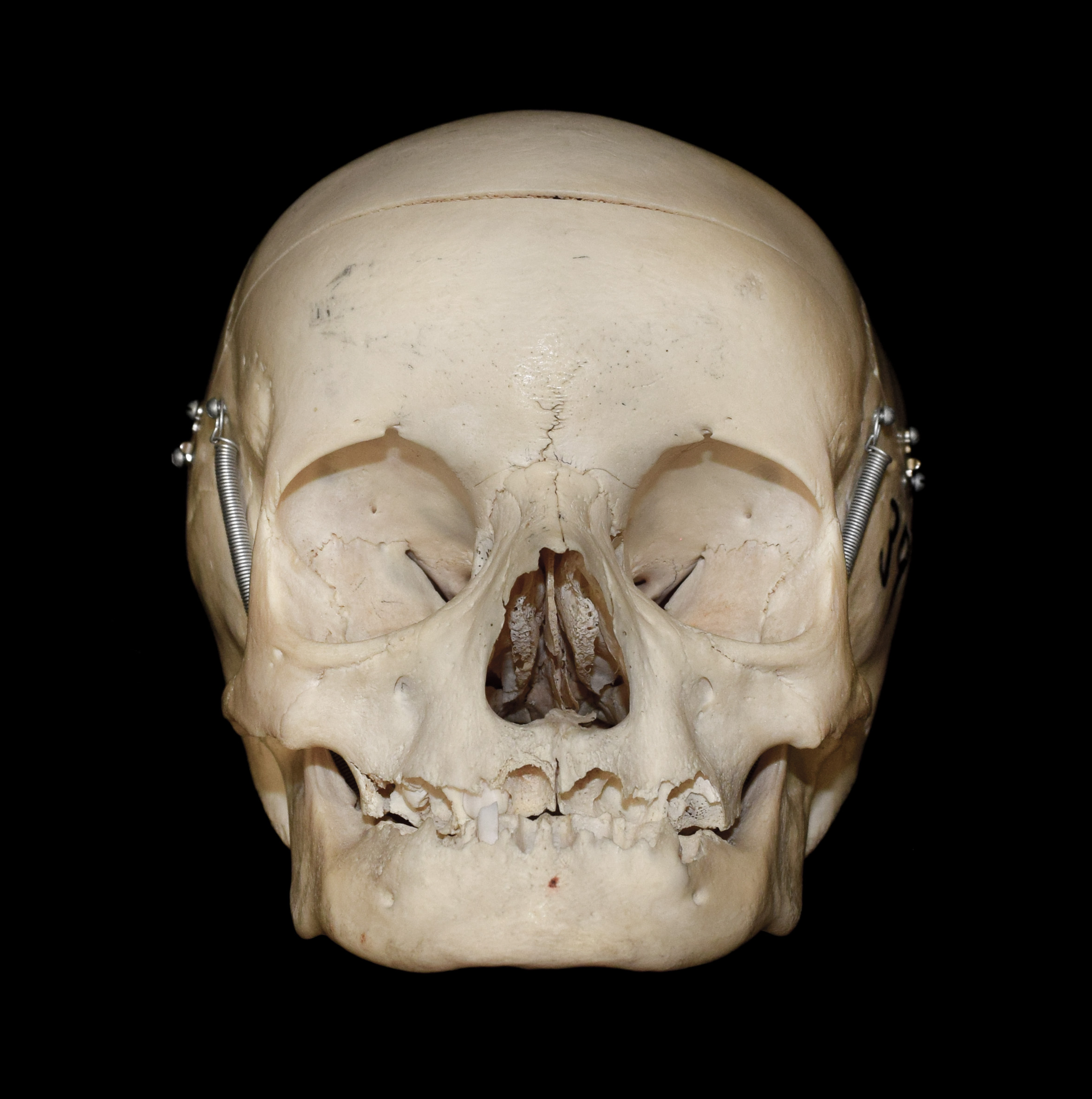 Juvenile human skull. Cranium width 14.5 cm. Anterior view. |