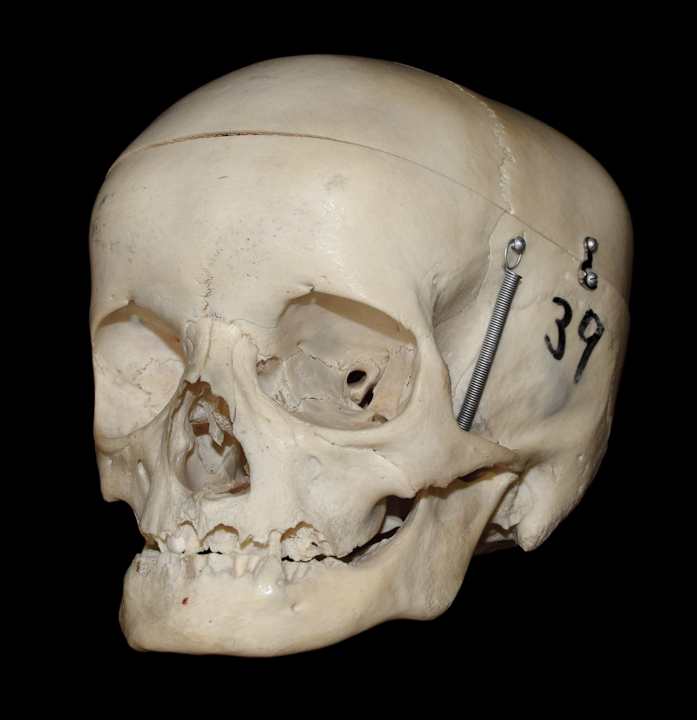 Juvenile human skull. Cranium width 14.5 cm. Left Anterolateral view. |