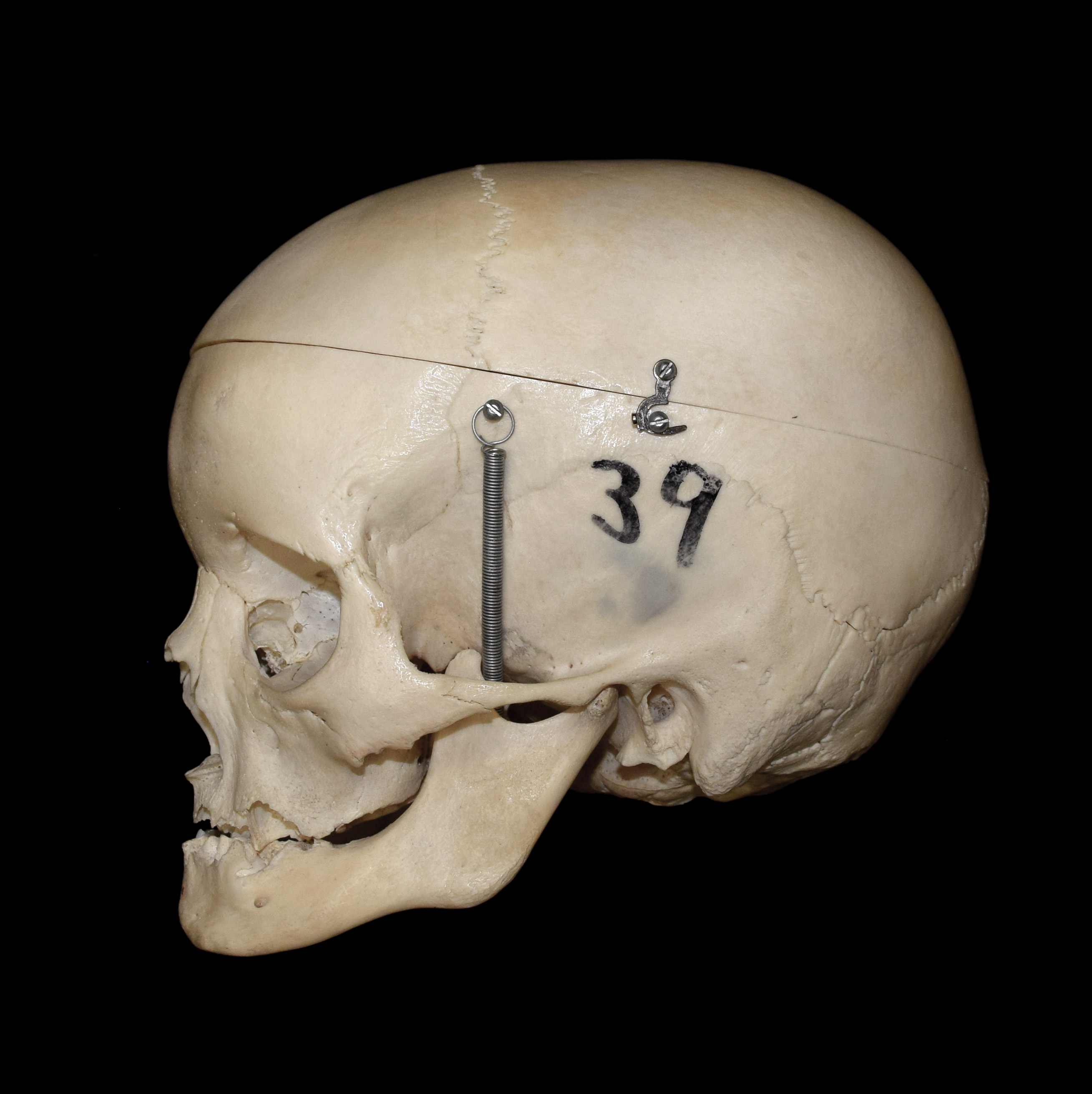 Juvenile human skull. Cranium width 14.5 cm. Left lateral view. |