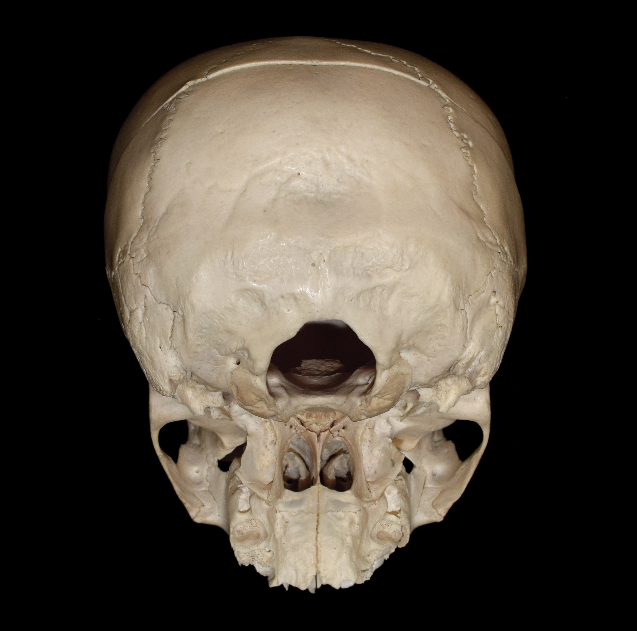 Juvenile human skull. Cranium width 14.5 cm. Posterior Inferior view. |