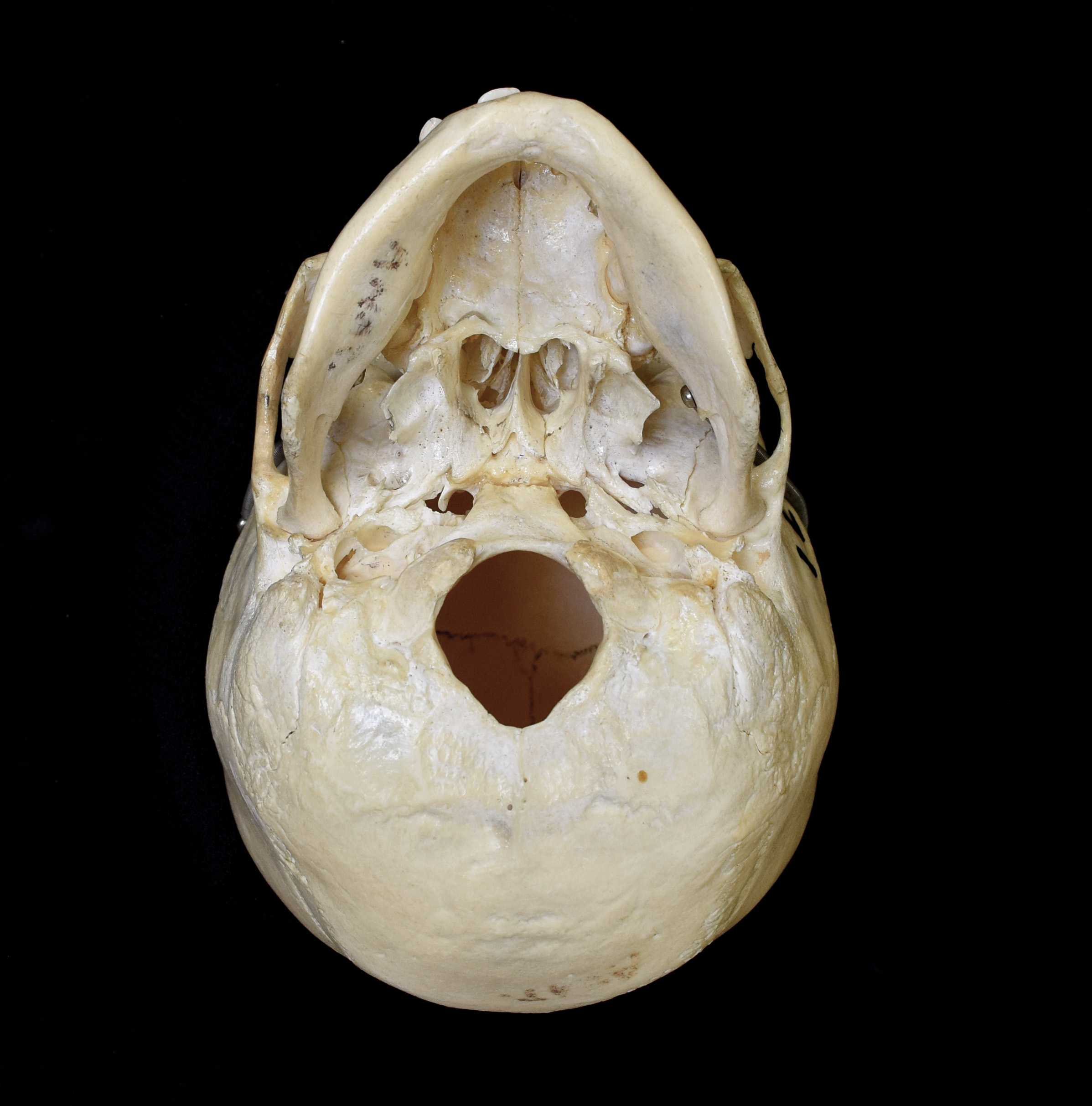 Juvenile human skull. Estimated age 9-10 years. Cranium width 12.5 cm. Basal view with mandible. |