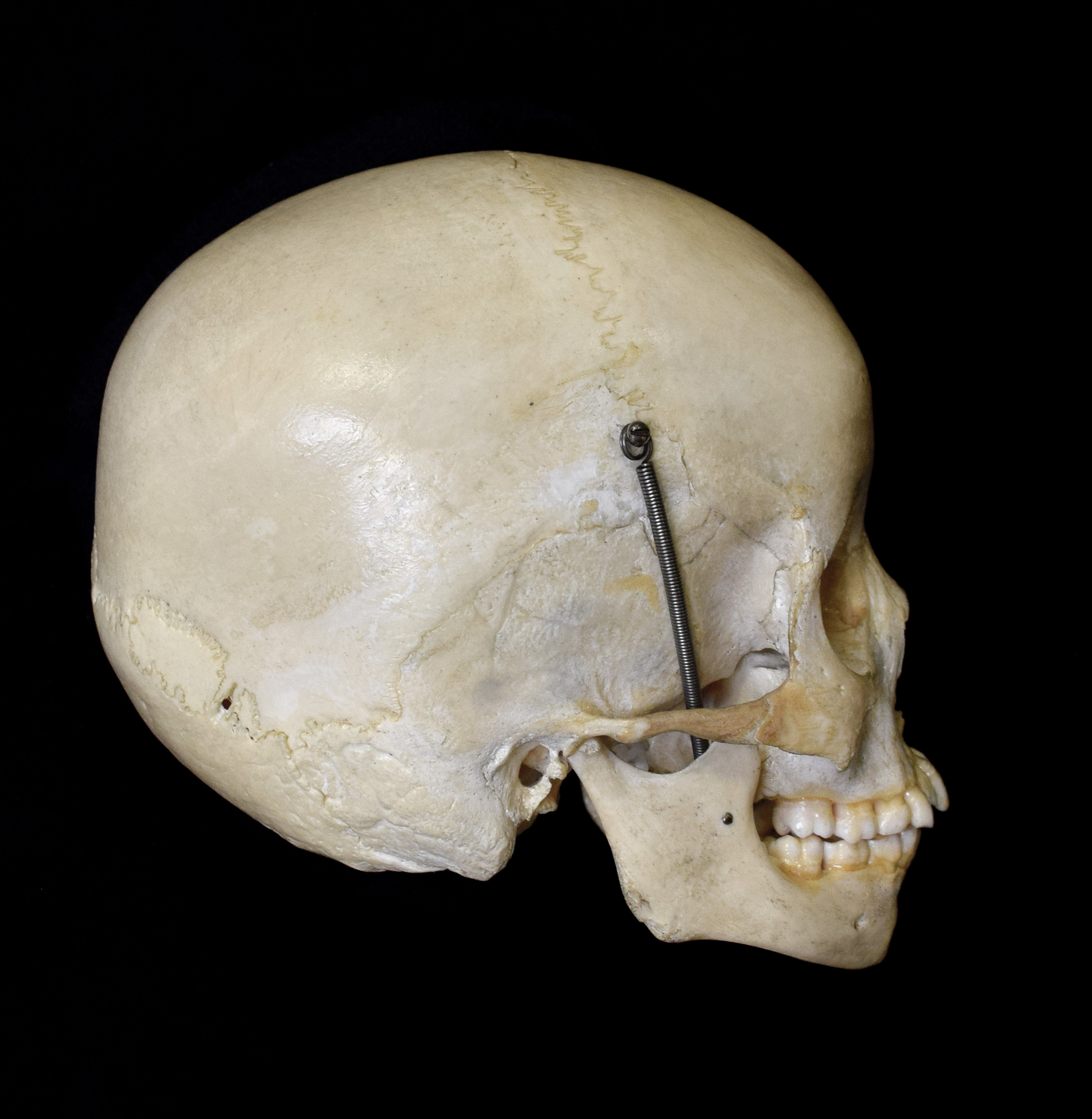 Juvenile human skull. Estimated age 9-10 years. Cranium width 12.5 cm. Right lateral view. |