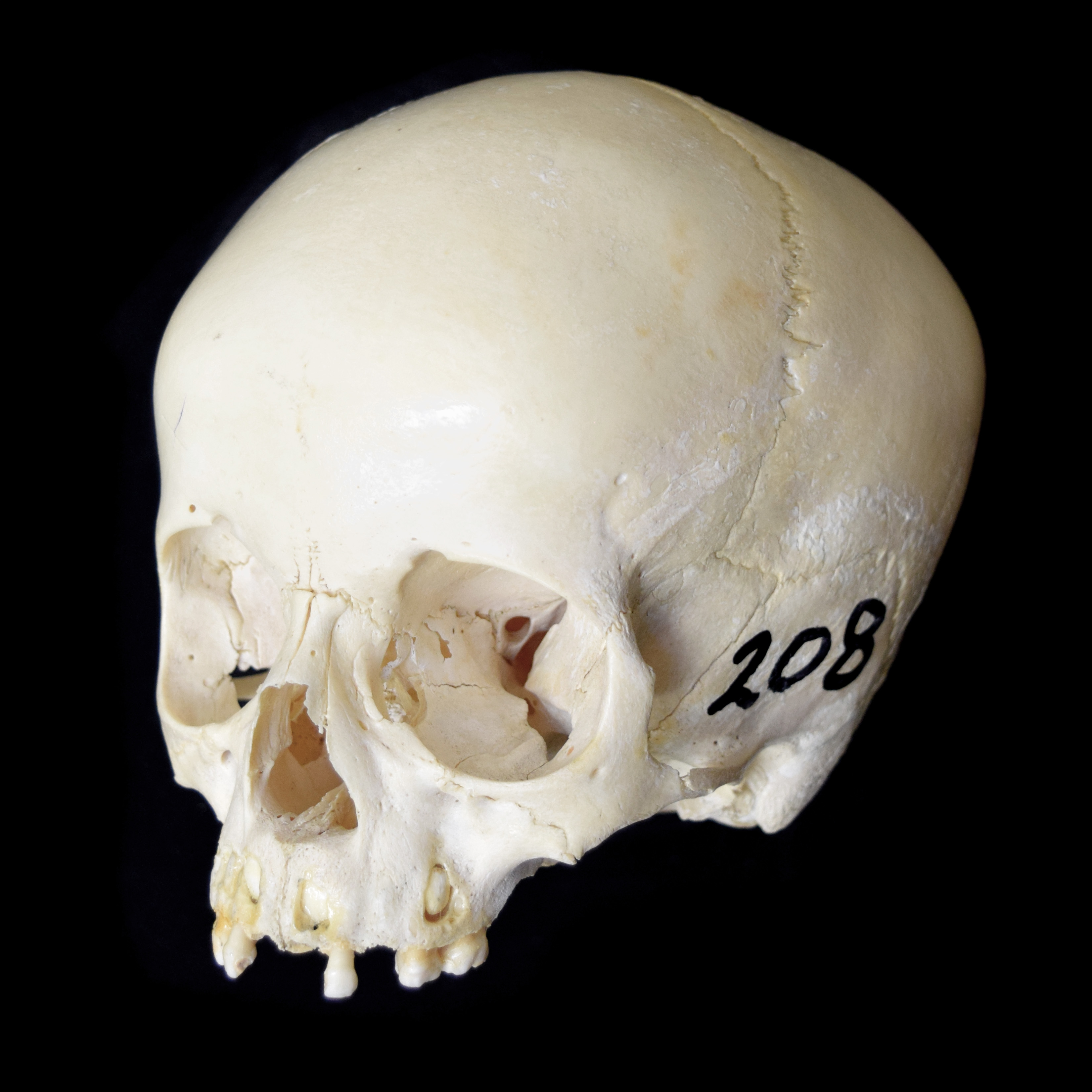 Juvenile human skull. Estimaged age 5-6 years. Cranium width 14.0 cm. Left anterolateral view. |