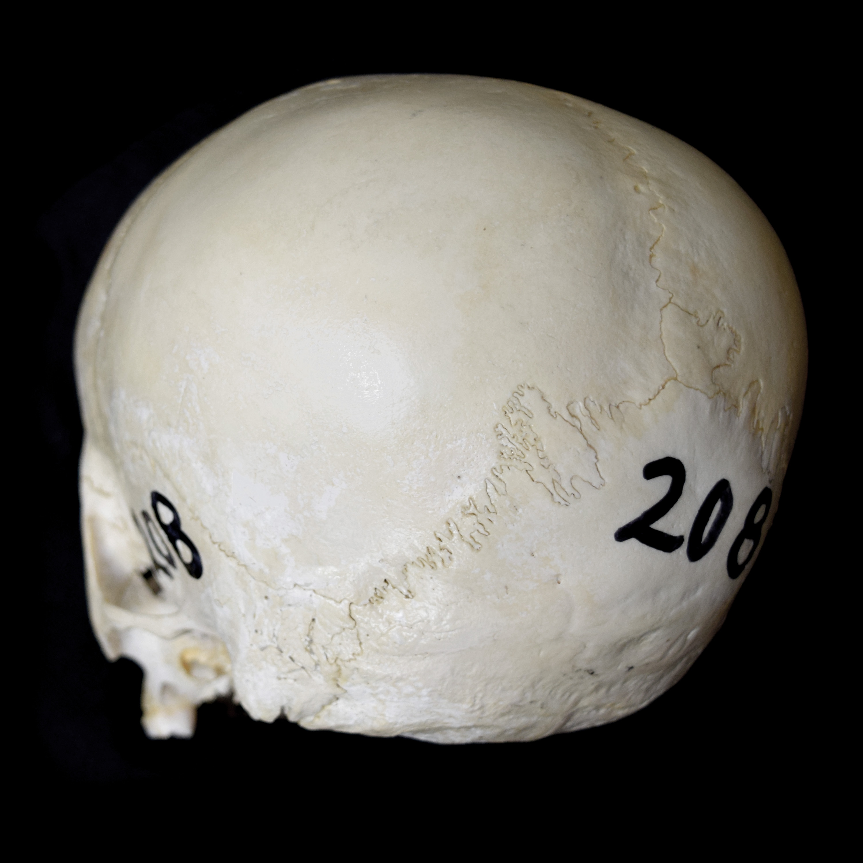Juvenile human skull. Estimaged age 5-6 years. Cranium width 14.0 cm. Left posterolateral view. |
