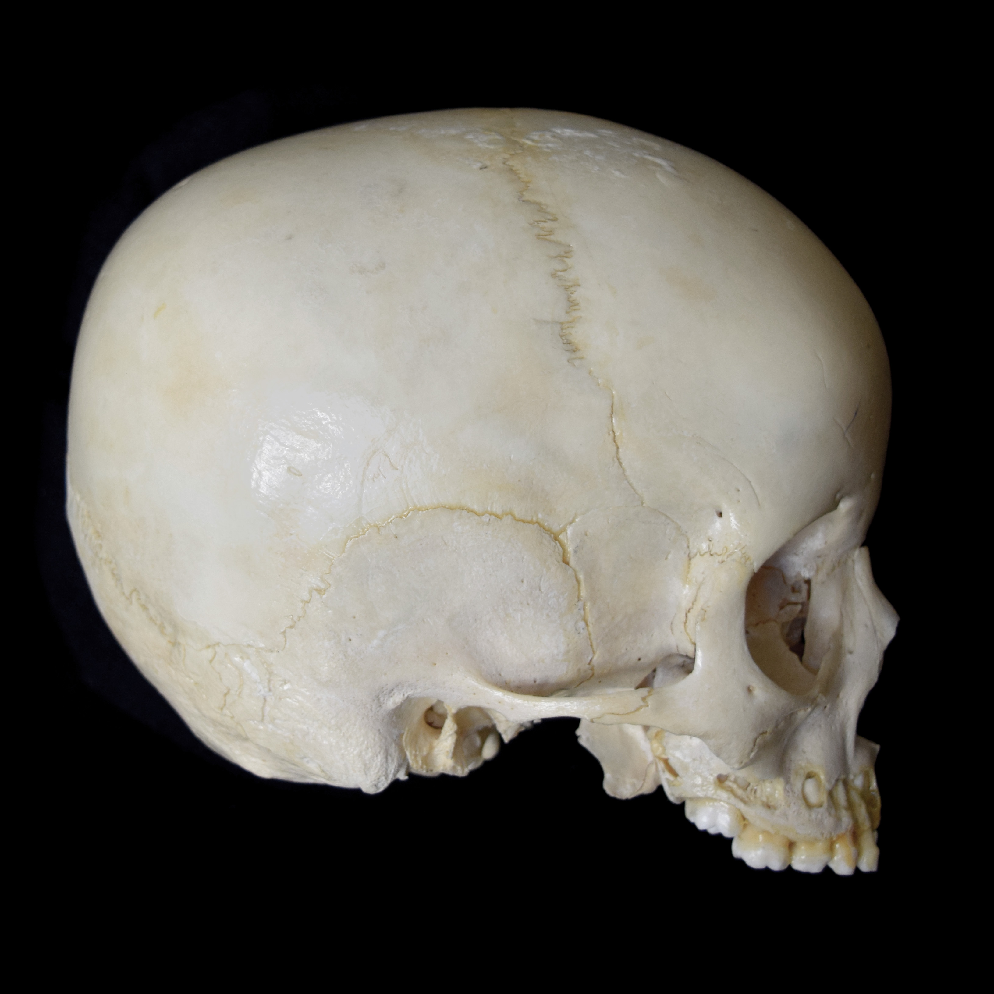 Juvenile human skull. Estimaged age 5-6 years. Cranium width 14.0 cm. Right lateral view. |