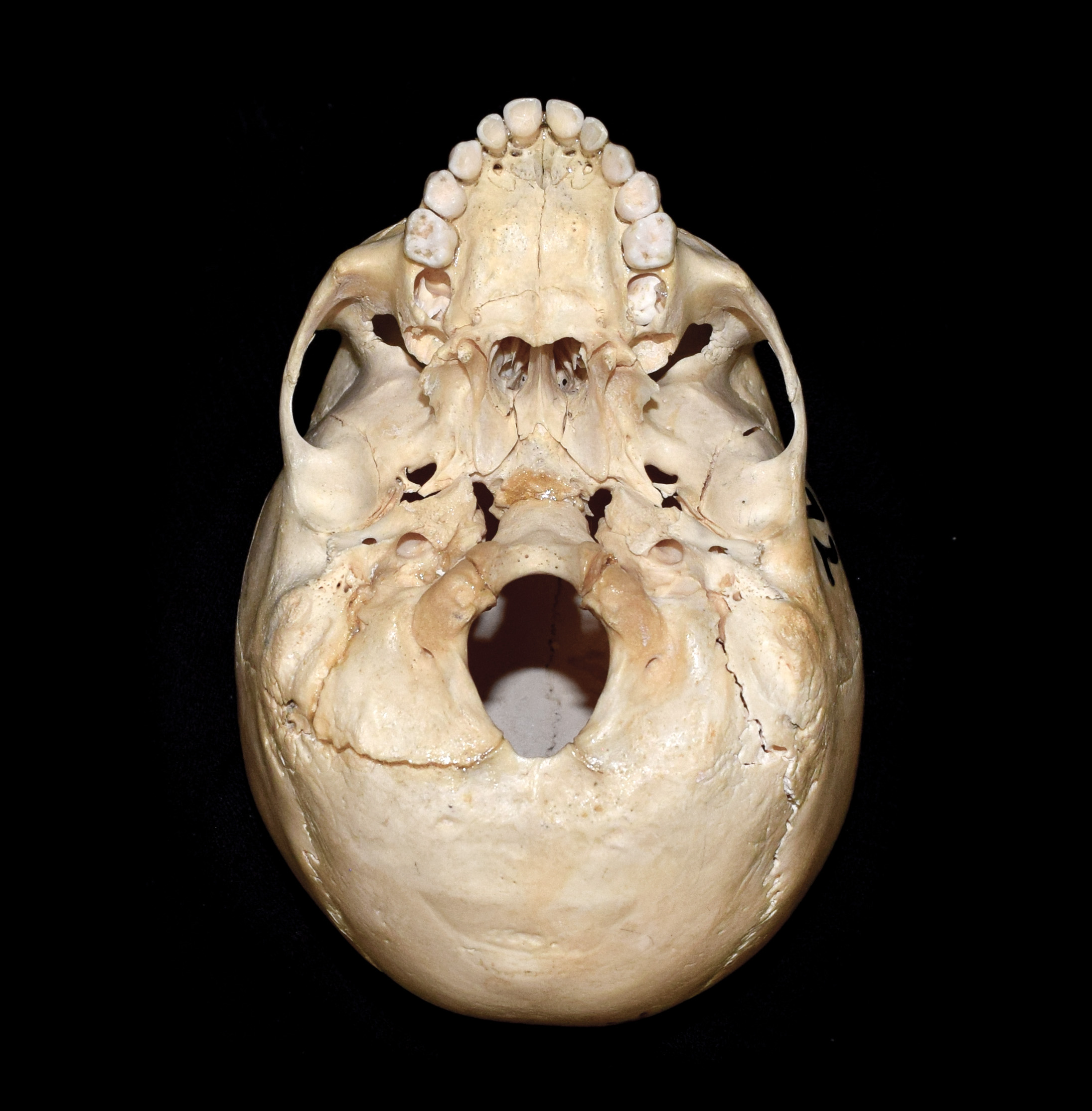 Juvenile human skull. Estimated age 3-4 years. Cranium width 12.0 cm. Basal view. |