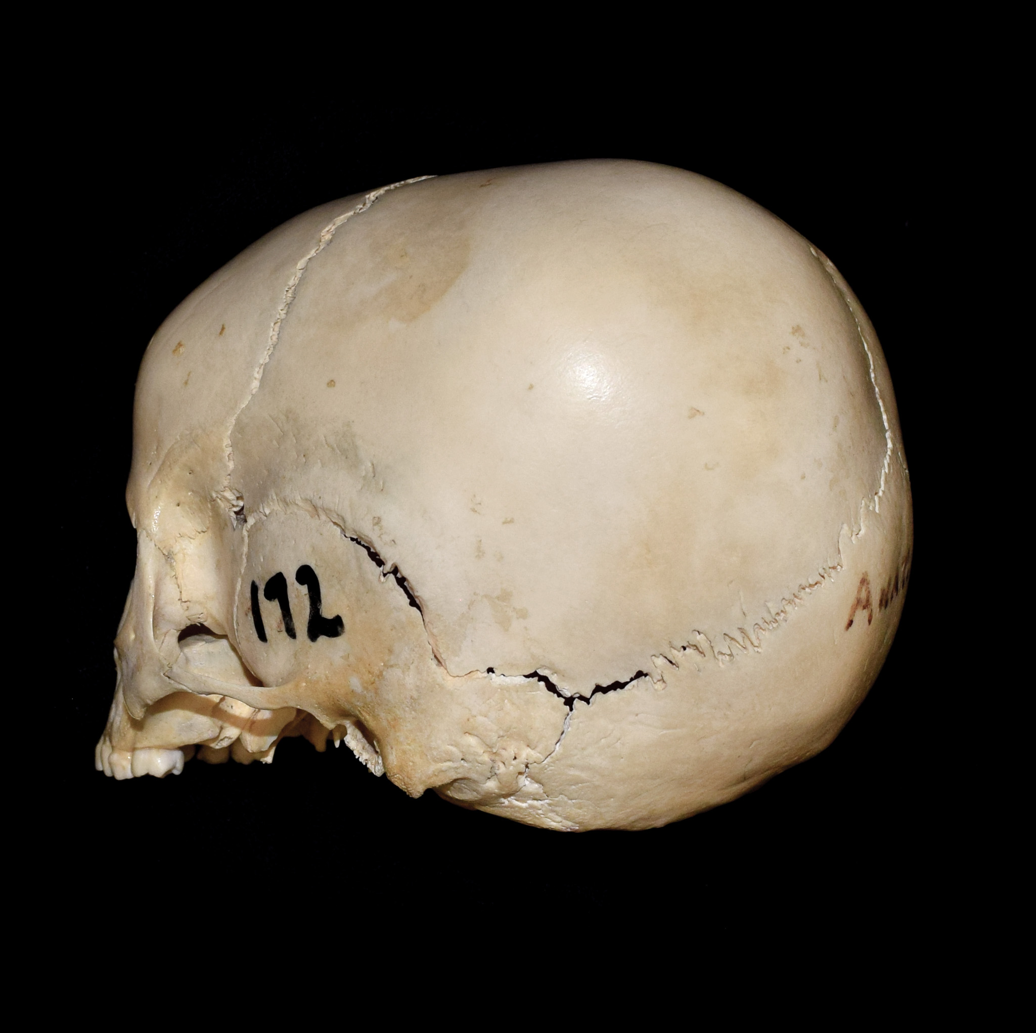Juvenile human skull. Estimated age 3-4 years. Cranium width 12.0 cm. Left posterolateral view. |