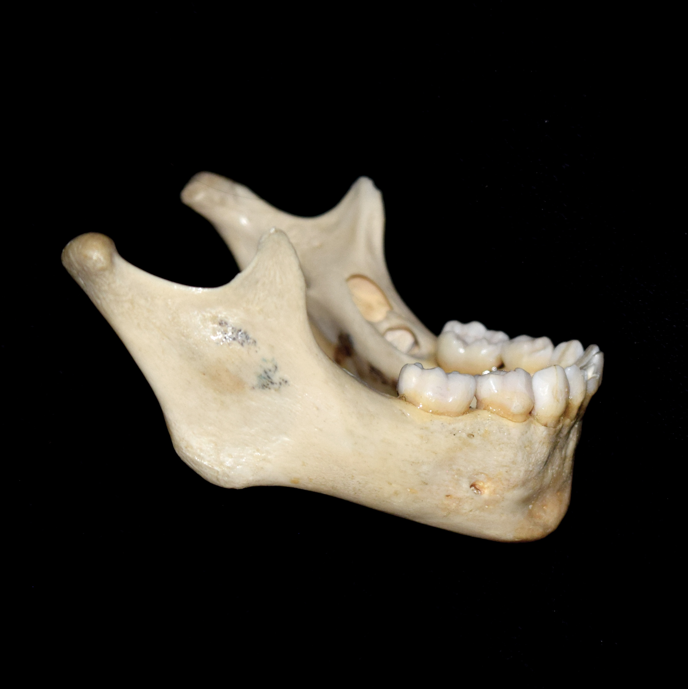 Mandible of juvenile human skull. Estimated age 3-4 years. Right lateral view. |
