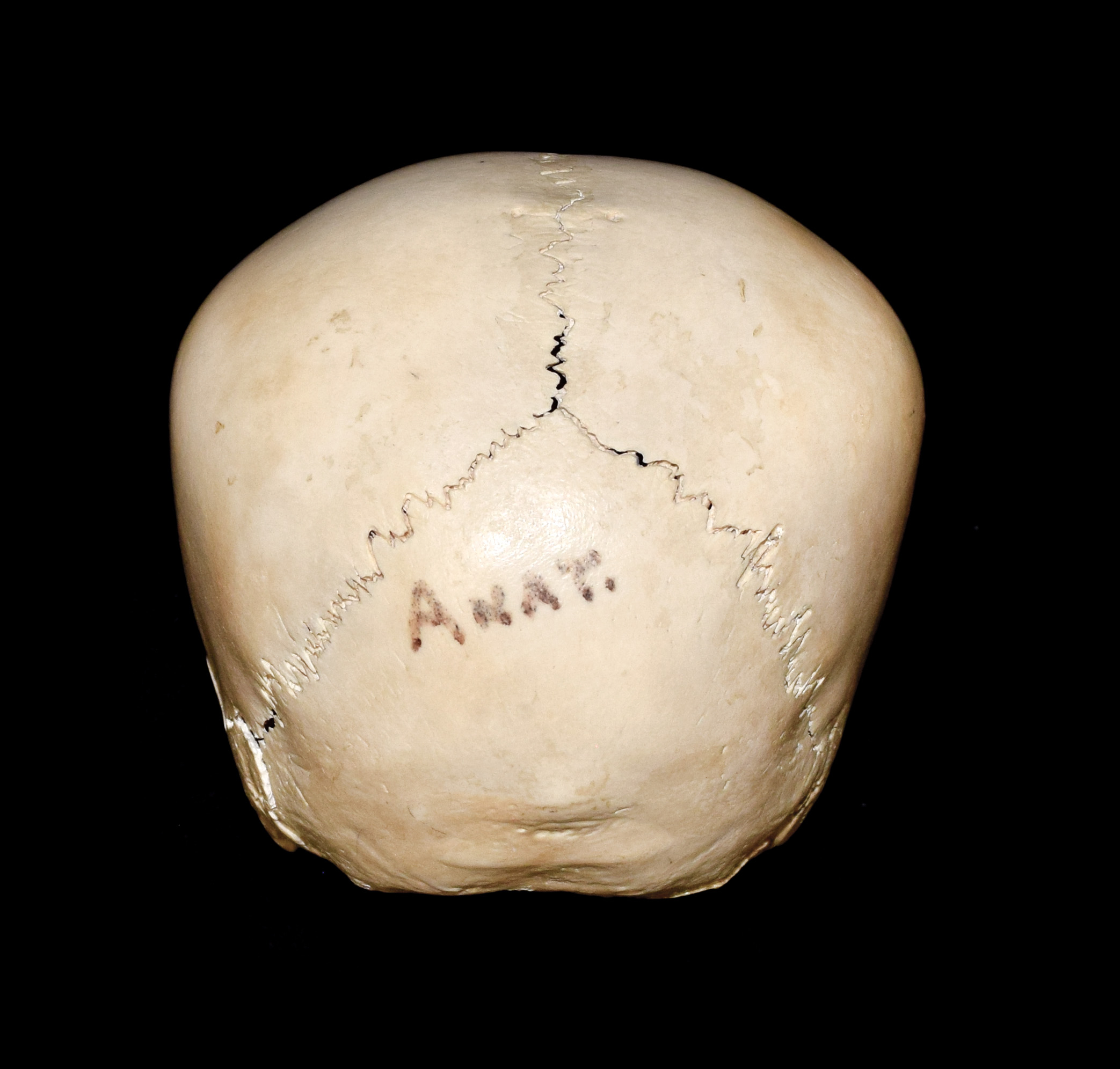 Juvenile human skull. Estimated age 3-4 years. Cranium width 12.0 cm. Posterior view. |