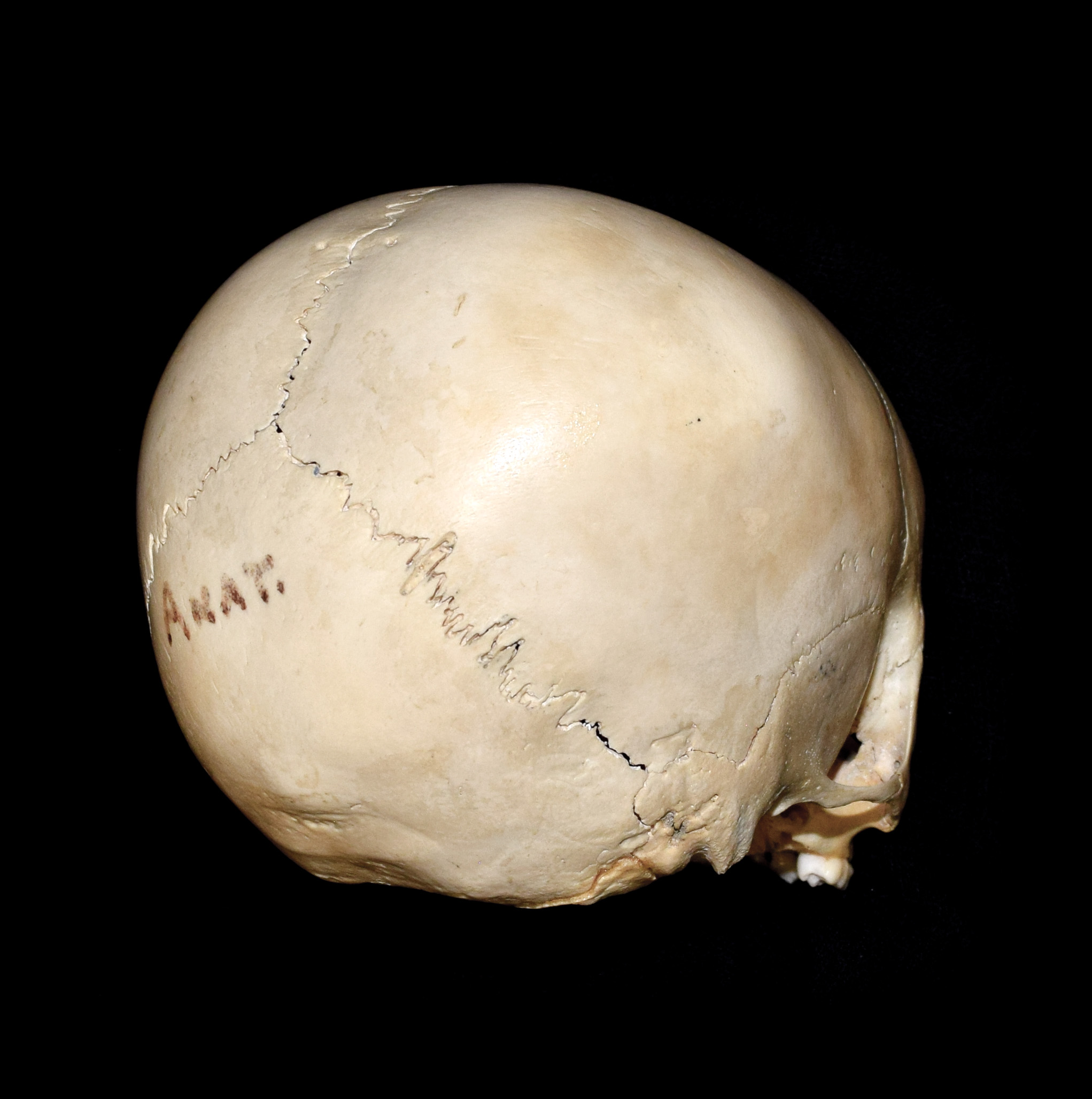 Juvenile human skull. Estimated age 3-4 years. Cranium width 12.0 cm. Right posterolateral view. |