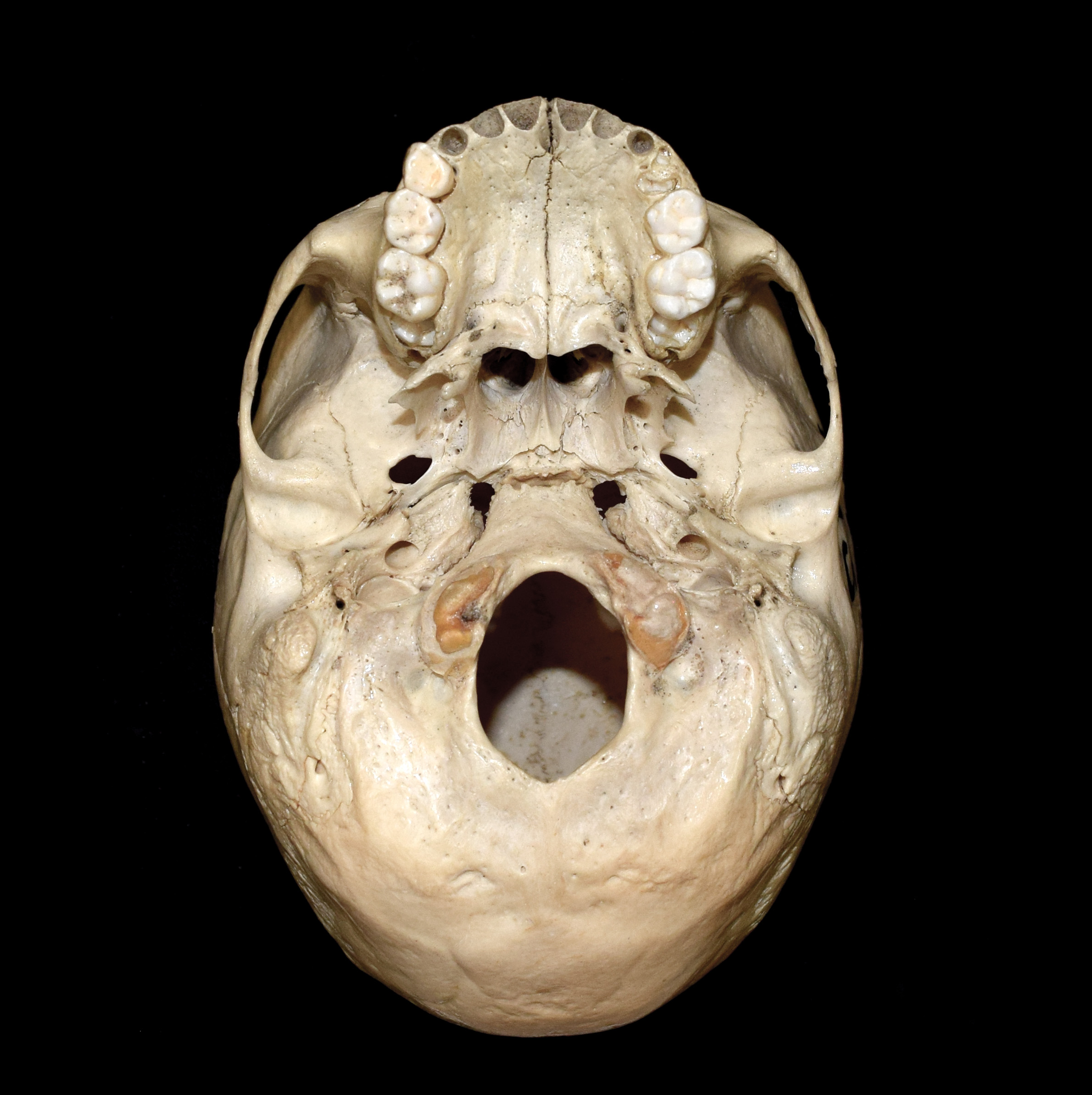 Juvenile human skull. Estimated age 7-9 years. Cranium width 12.7 cm. Basal view. |