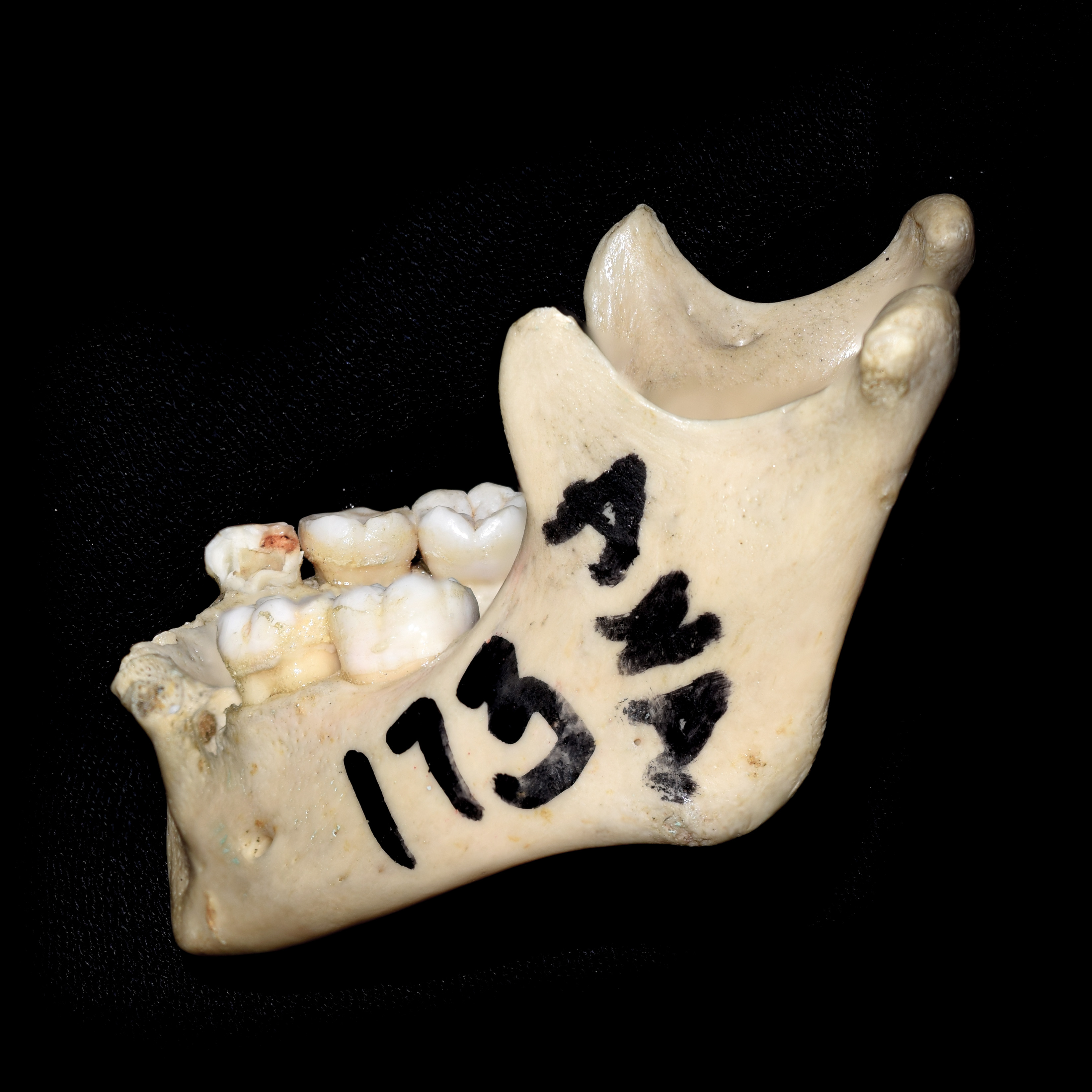 Mandible of juvenile human skull. Estimated age 7-9 years. Right lateral view. |
