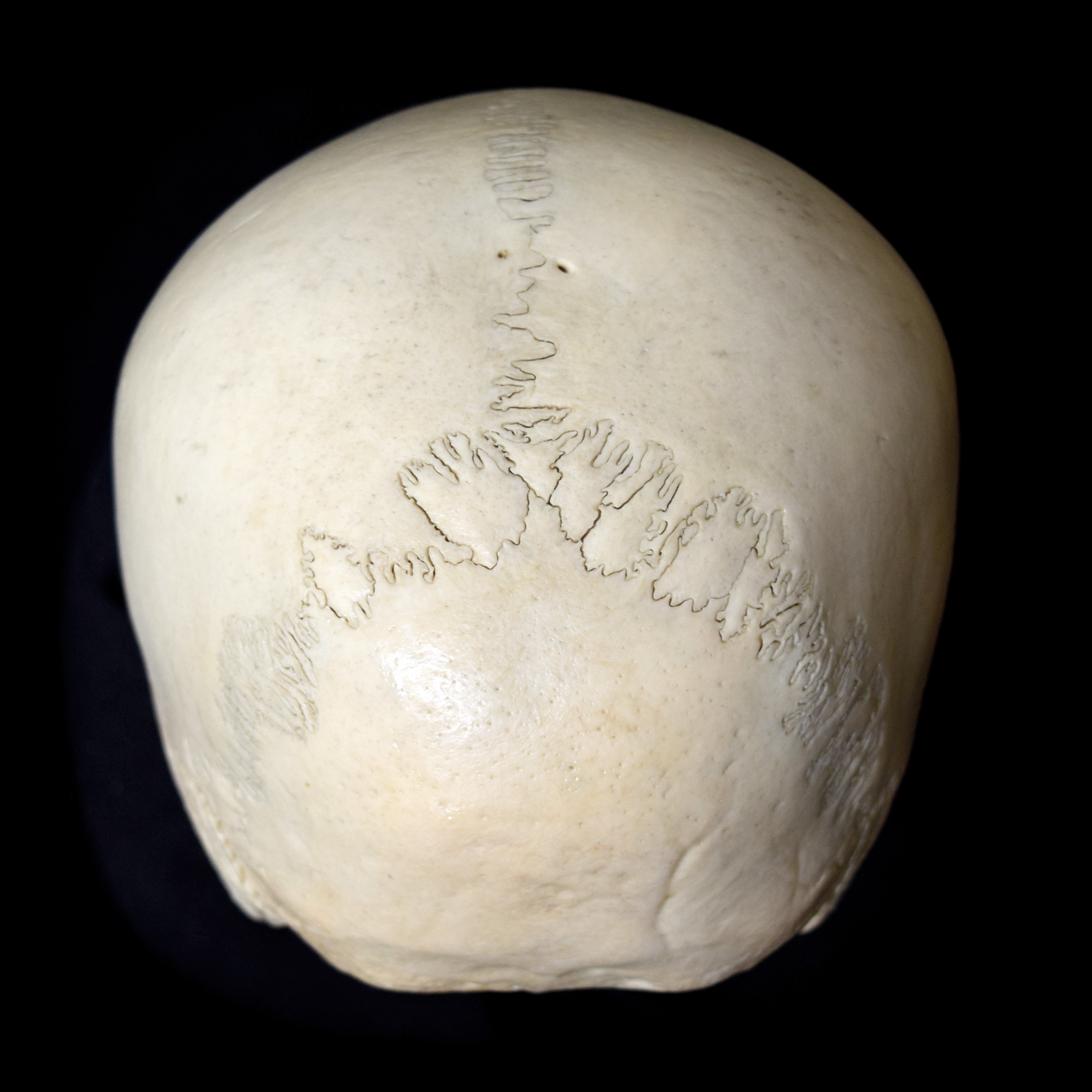 Juvenile human skull. Estimated age 7-9 years. Cranium width 12.7 cm. Posterior view. |